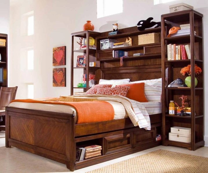 Betten mit einem festen Kopfteil machen es möglich, einen Platz nicht nur für eine Lampe oder ein Paar Souvenirs, sondern auch für eine ganze Bibliothek zu schaffen. Die Möglichkeit von Betten mit einem weichen Rücken ist aufgrund der Merkmale der Ausführung und des Designs etwas geringer.