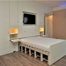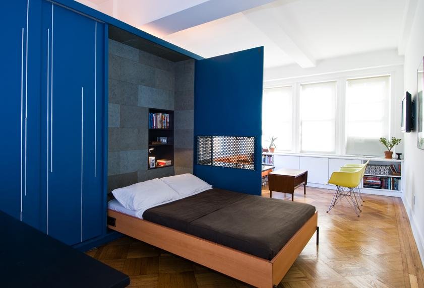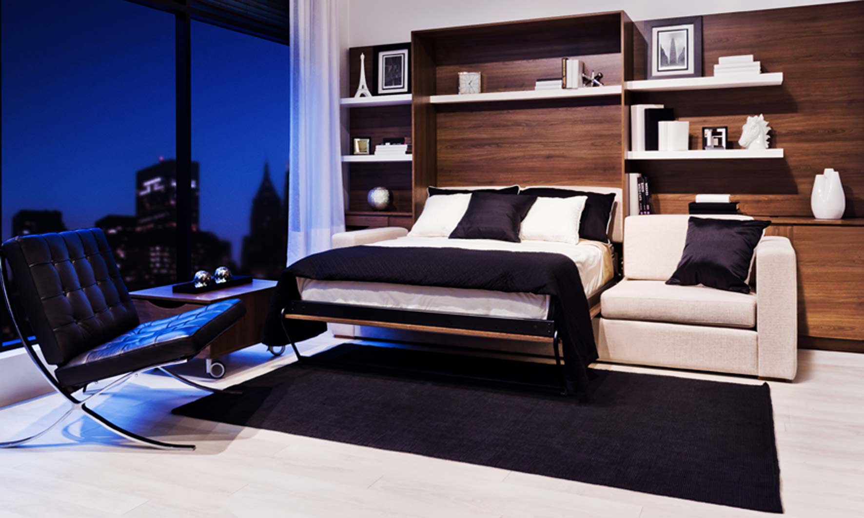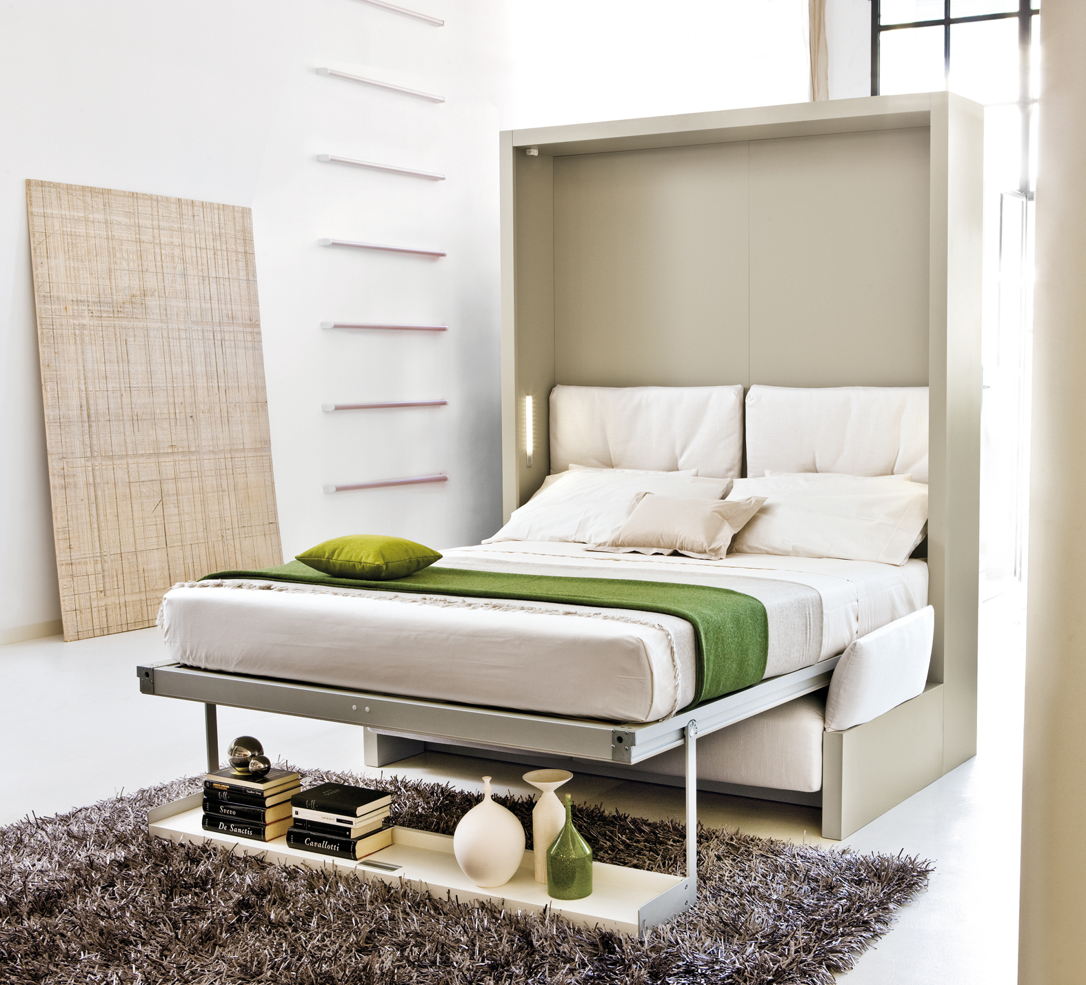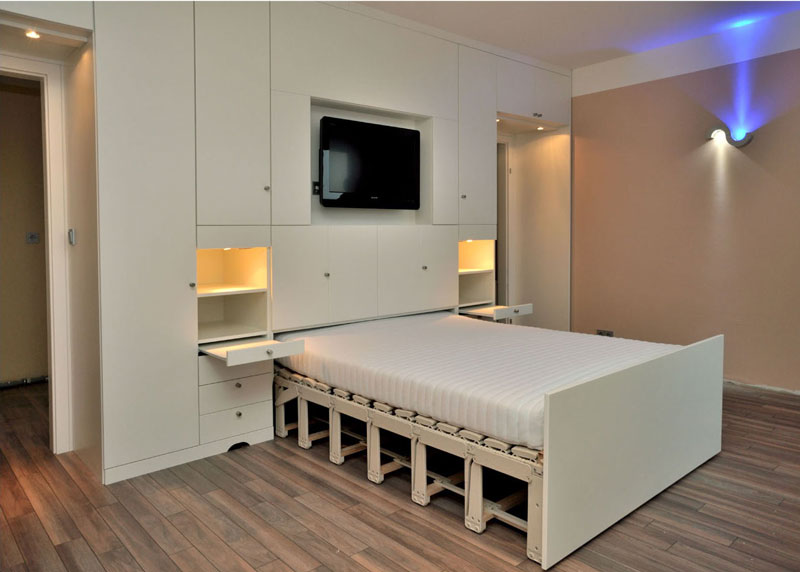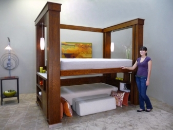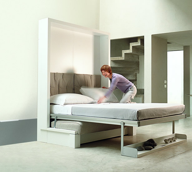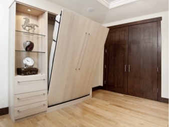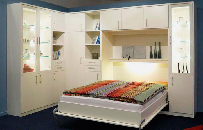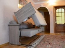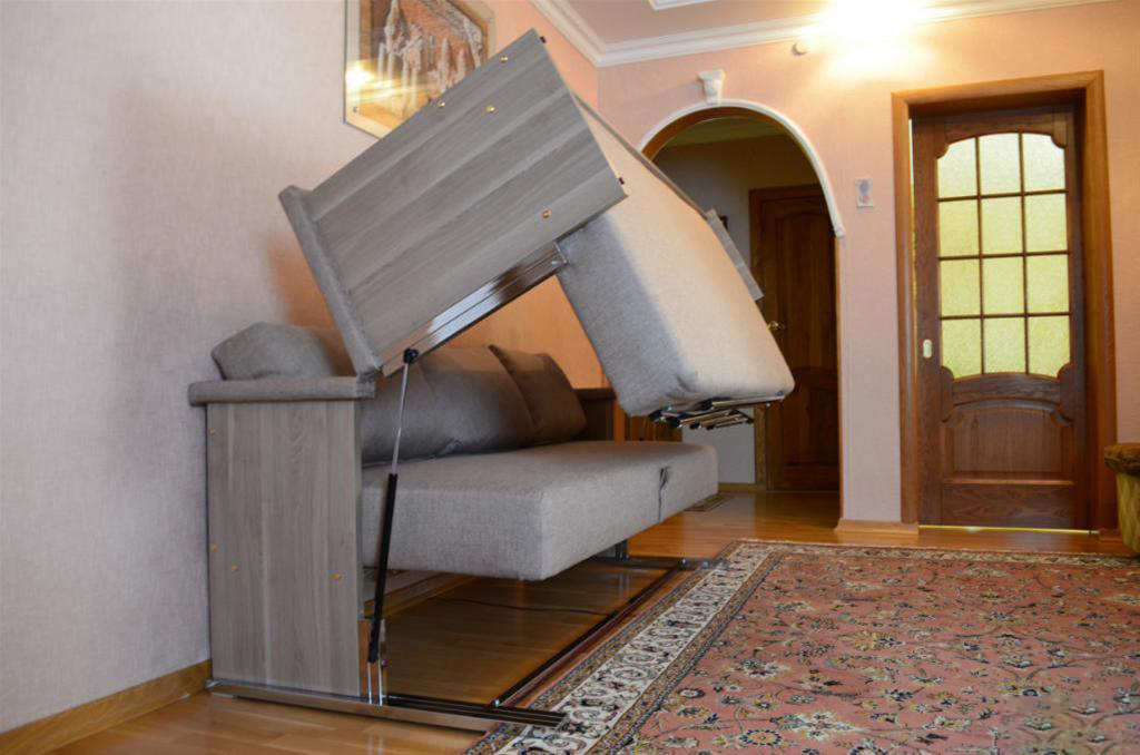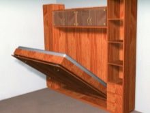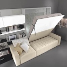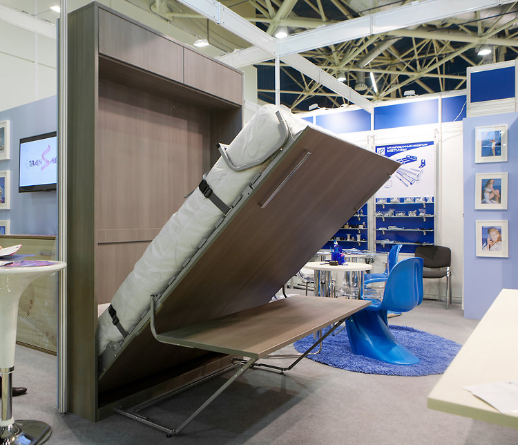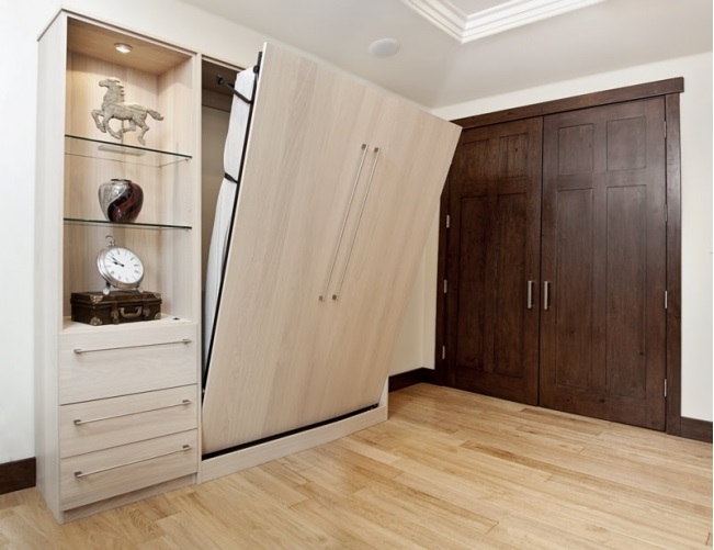 Diese Art von multifunktionalen Möbeln ist eine der interessantesten. Im zusammengeklappten Zustand gibt ein solches Produkt den gesamten Platz frei, den es tagsüber einnimmt. Wenn man ein solches Produkt herstellt, muss man einen ziemlich komplizierten Mechanismus verwenden, daher ist solch ein Bett eine der teuersten Möbeloptionen aus der ganzen Liste.