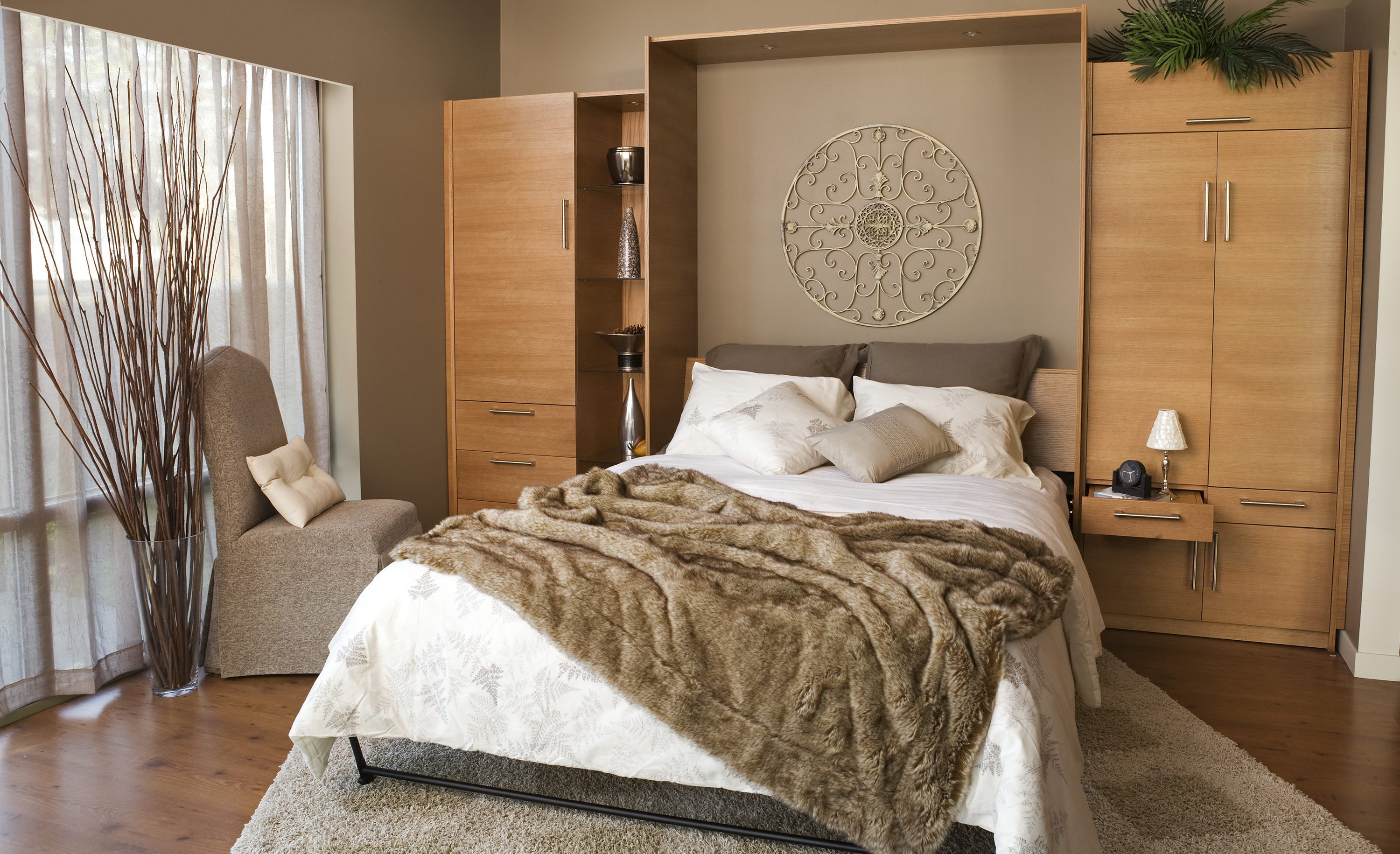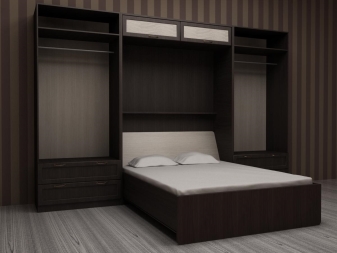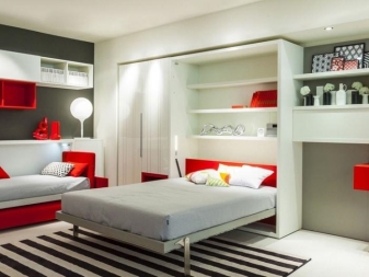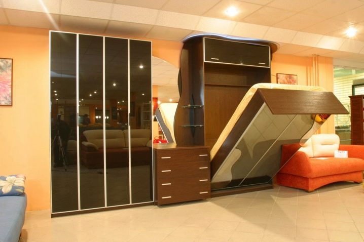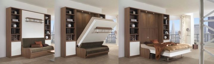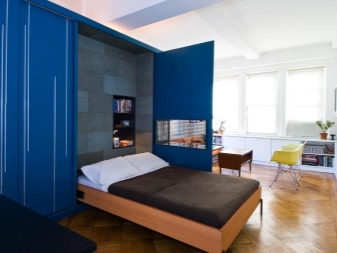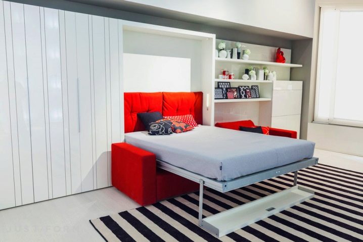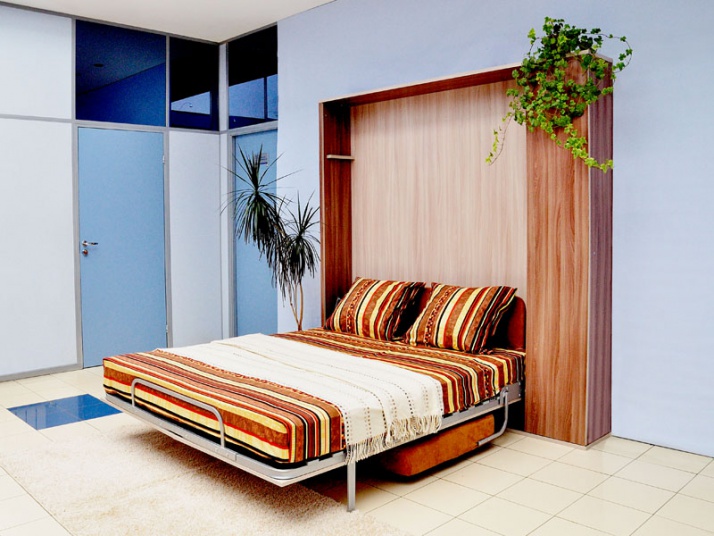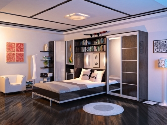Zusammen mit den Sofas, die sich entfalten, können Sie ein stilvolles Verwandlungsbett aufheben. Dies ist ein klassisches horizontales Bett, das sich nicht an die Wand lehnt, sondern herunterklappt. Diese Option ist praktisch, wenn Sie möchten, dass Ihr Bett groß und bequem ist, aber tagsüber ist der Platz geräumt.