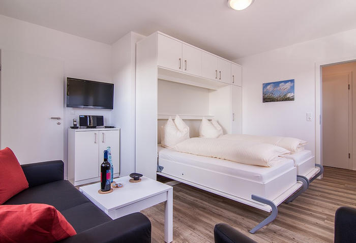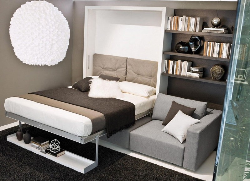 Ein solches Bett ist in seinem Design komplizierter. Aber es kann Tag und Nacht verwendet werden. Diese Option ist nicht nur ein Bett, das sich in einer Nische in der Wand versteckt.Unten unter dem Bett ist eine niedrige Couch zusammengeklappt. Daher, wenn das Bett aufsteigt und sich im Schrank versteckt, ist darunter kein leerer Raum, sondern ein bequemer Platz zum Ausruhen, wo Sie mit Ihren Freunden oder Verwandten übernachten können. Diese Option ist ideal für moderne kleine Räume, in denen ein Raum sowohl das Wohnzimmer als auch das Schlafzimmer spielt.
