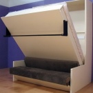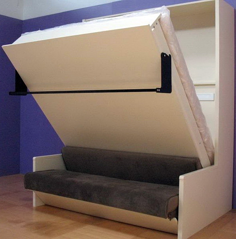 Die Lebensdauer eines Qualitätsbetts ist viel höher als bei Standardsofas. Zu den Vorteilen zählen auch die bequemen Hebemechanismen des Bettes, unter denen sich eine große Nische zum Aufbewahren von Gegenständen befindet. Dies hilft, Platz zu sparen, ohne Abrichter und verschiedene Schränke für die Aufbewahrung im Raum zu verwenden.Zu den Hauptnachteilen zählt das umständliche Design, schließlich nimmt das Sofa mehrere Male weniger Platz ein, zumal man es einfach aufrollen und den Raum tagsüber für andere Zwecke nutzen kann. In diesem Fall kann ein zusammenklappbares Bett zu Hilfe kommen, das bei Bedarf in einen Schrank verwandelt werden kann.