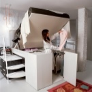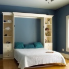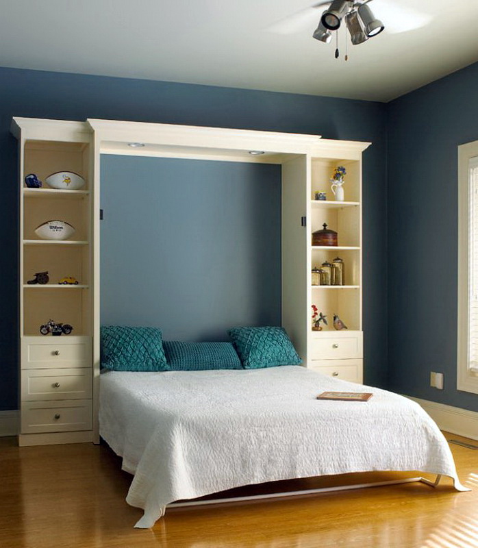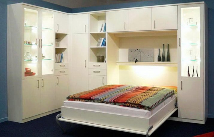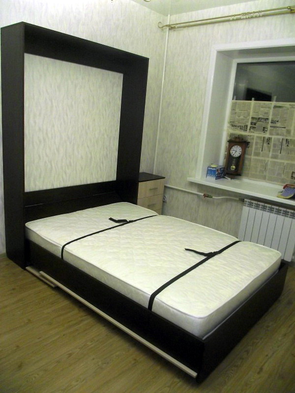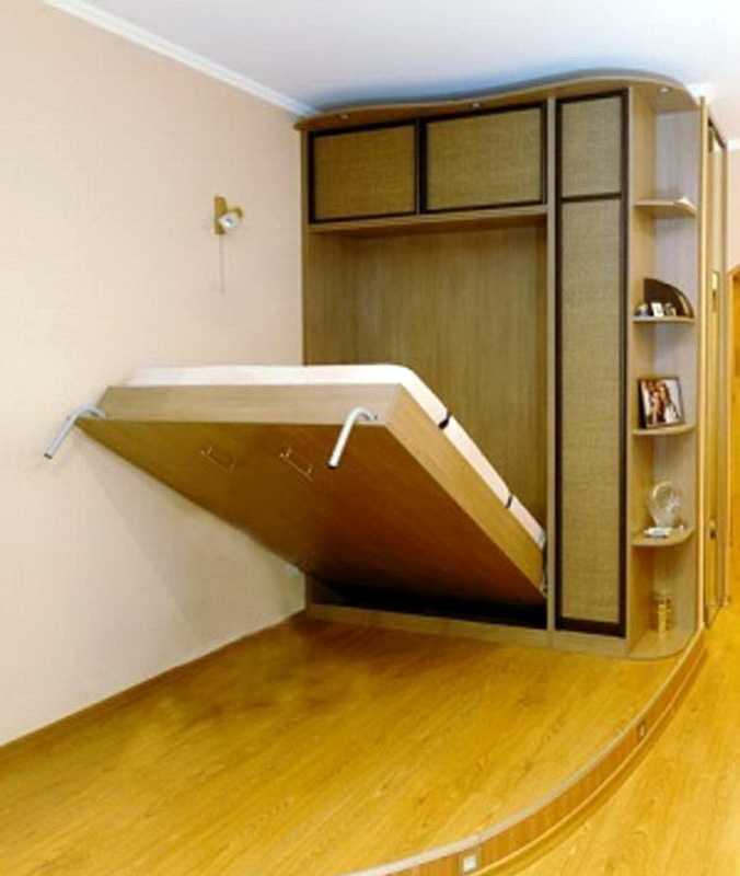 Für einen kleinen Raum gibt es ungewöhnliche Modelle. Zum Beispiel bei einem Klapp- oder Klappbett wird diese Option vor dem Zubettgehen begradigt, und wenn es nicht mehr benötigt wird, rollt es sich an die Wand und verwandelt sich optisch in eine Garderobe oder ein Sofa.. Das Faltmodell wird meistens ohne Kopfteil ausgeführt, und seine Funktion wird von der Rückwand des Schrankes ausgeführt, in die das Bett entfernt wird. Für eine Familie mit einem Kind in einer kleinen Wohnung gibt es eine gute Option: ein zweistöckiges Doppelbett. Normalerweise ist eine Etage nur ein Doppelbett, und die zweite ist ein komplettes Einzelbett, so dass genug Platz für Eltern und Kinder ist.