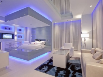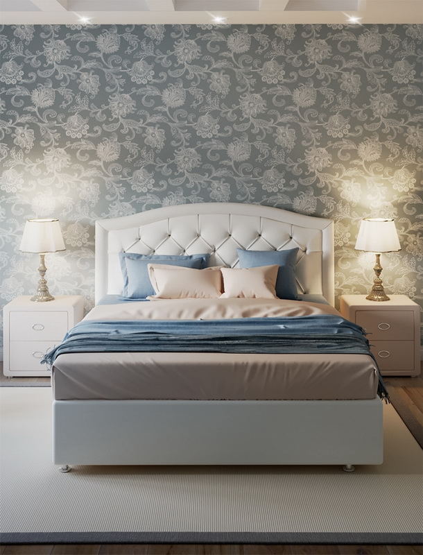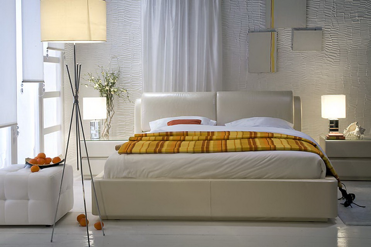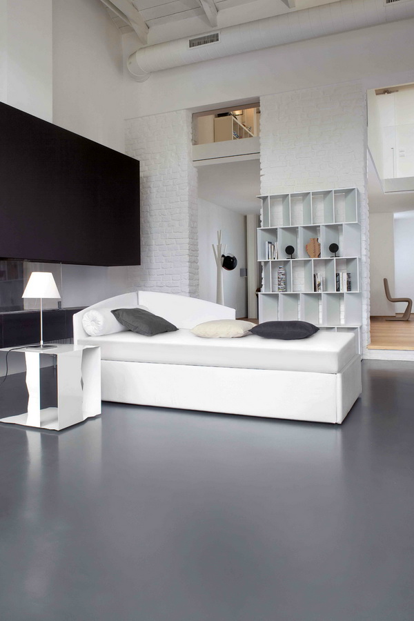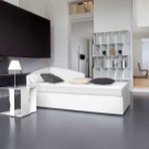 Die einfarbige Designoption ist heutzutage ziemlich üblich. In diesem Fall wird die Farbe des Bettes in der Farbe der Wände gewählt.Diese Technik hilft, den Raum visuell zu verlängern und ist ideal für einen kleinen Raum. Zum Beispiel, weiße Wände und ein weißes Bett wird dazu beitragen, den Raum deutlich zu erhöhen, sowie Raumlicht hinzufügen. Es sollte jedoch daran erinnert werden, dass selbst bei dieser Entscheidung ein paar kontrastierende Elemente gesetzt werden müssen, in dieser Ausführungsform sollten sie klein sein, Lampen oder Nachttische werden ausreichen.