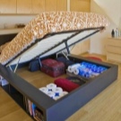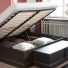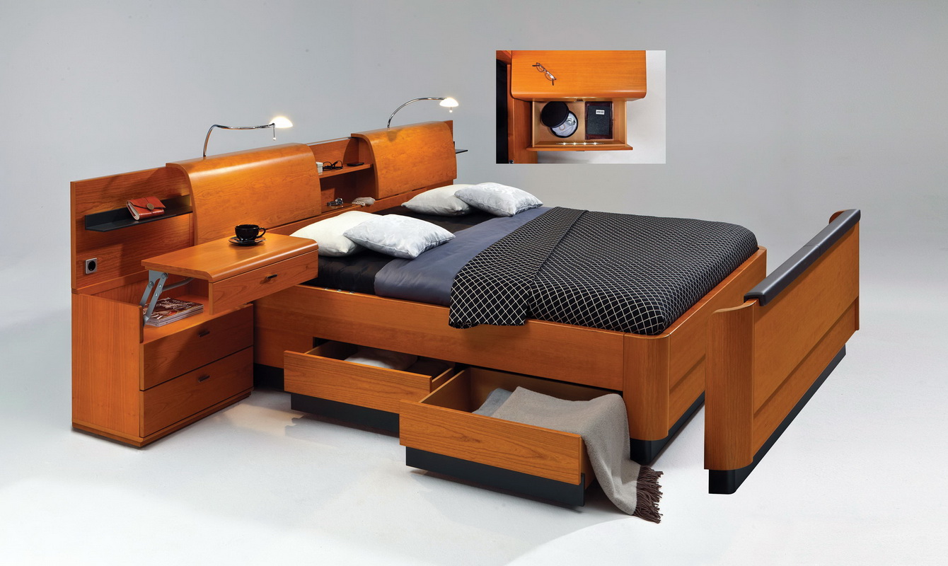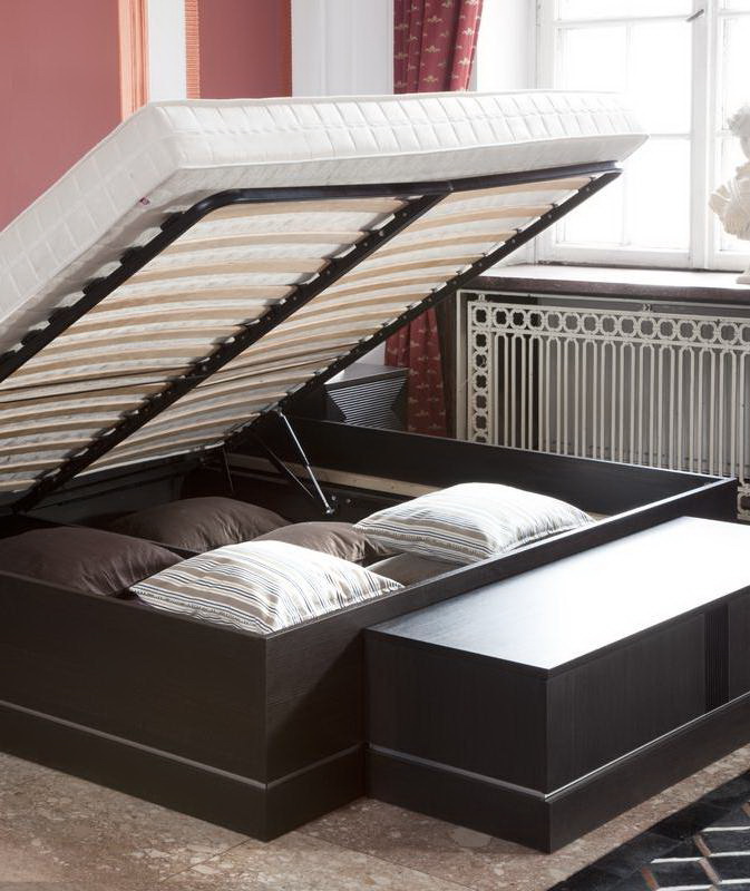 Bei der Auswahl eines Bettes in einem kleinen Raum sollten Sie auf Modelle mit eingebautem Aufbewahrungssystem achten. Zum Beispiel gibt es Betten mit Schubladendie sich in einer Nische unter der Matratze befinden.Es gibt Modelle mit einer Matratze, die auf einem Gaslift klettert, sie steigt auf und stellt auch eine Nische für die Lagerung an der Basis zur Verfügung. In den hohen Modellen gibt es Optionen mit Nachttischen, die in die Kopfteile eingebaut sind oder an beiden Seiten des Bettes angebracht sind, diese Schränke stellen auch einen großartigen Platz zum Verstauen dar. Es gibt auch Modelle mit SeitenlehneOft sind darin verschiedene Regale und Schubladen eingebaut, und wenn das Bett nicht an der Wand steht, ist dies auch eine gute Option für zusätzlichen Stauraum.