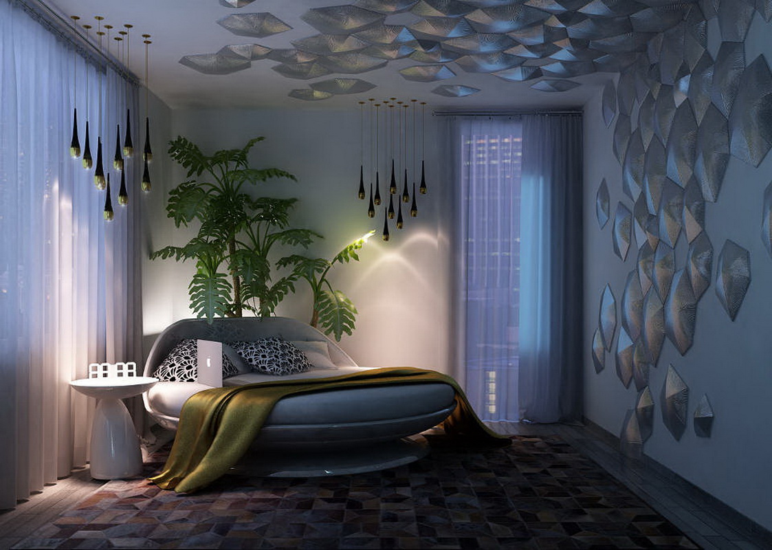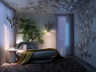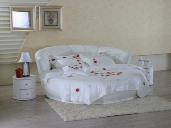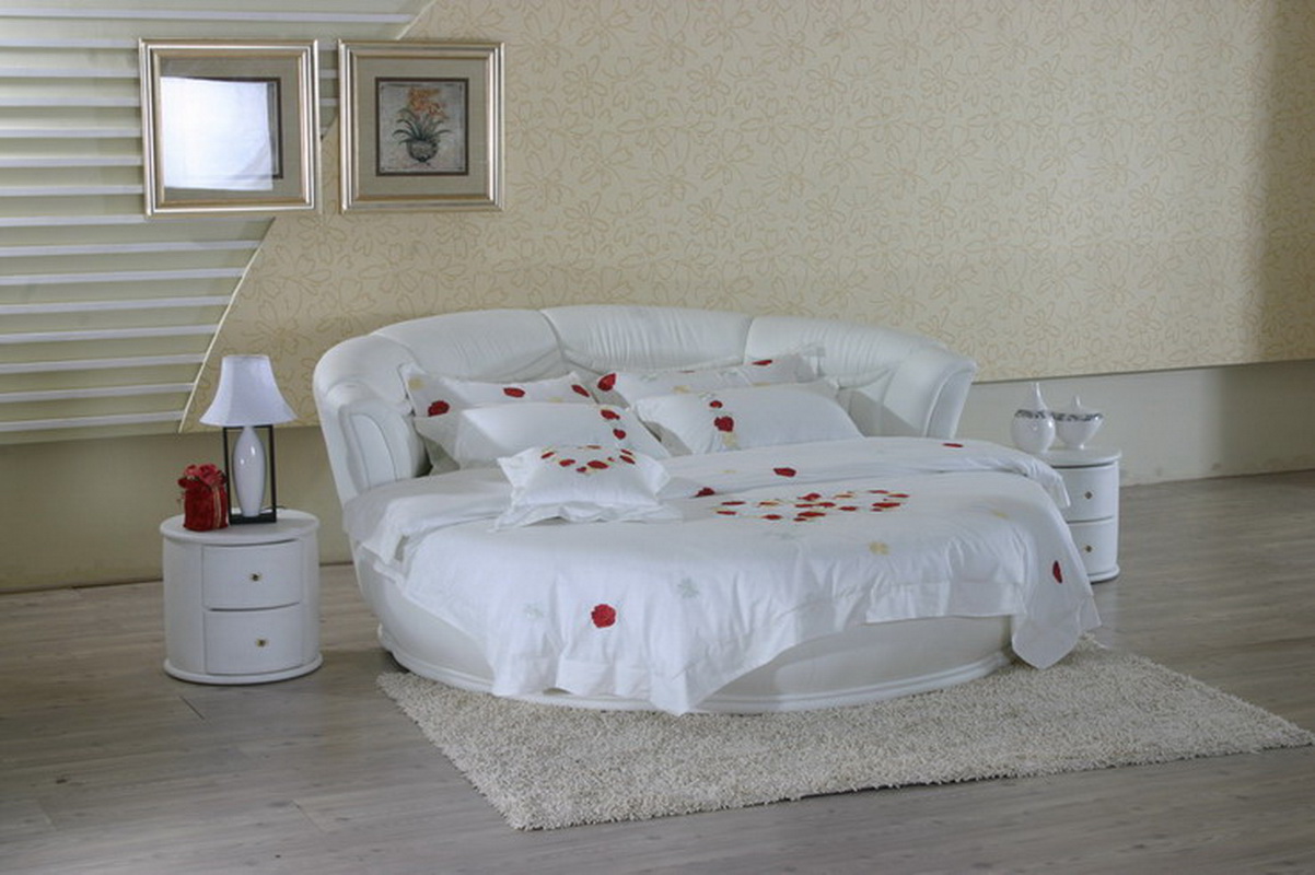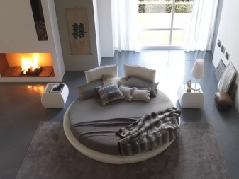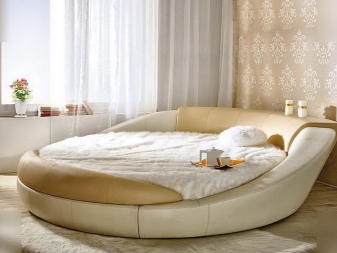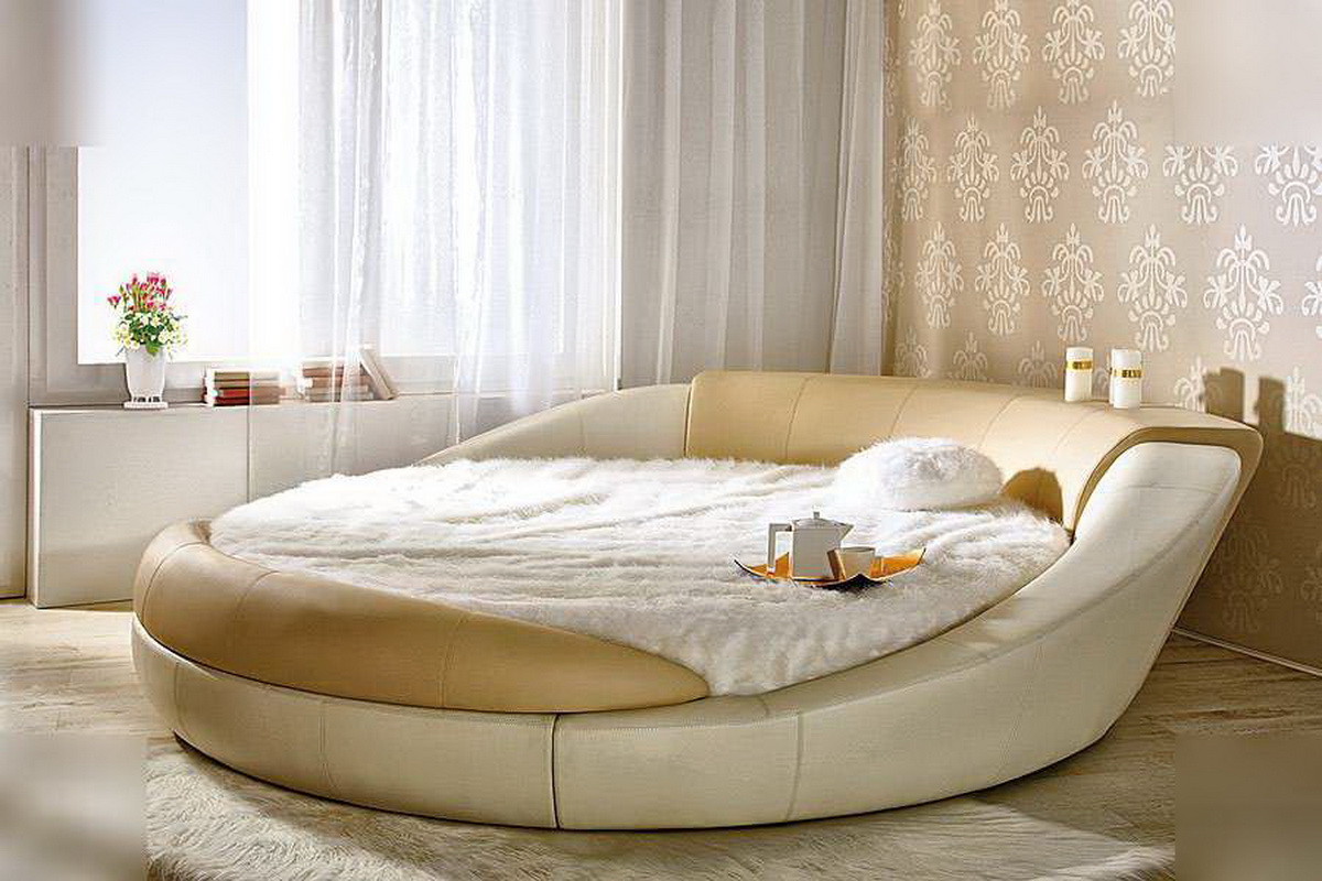- Sehr interessant im Inneren des Schlafzimmers sieht rundes Bett auss Der Durchmesser eines solchen Bettes beträgt normalerweise nicht weniger als 200 cm, jedoch ist es nicht sehr bequem zum Schlafen von zwei Personen, außerdem benötigt es ziemlich viel Platz.Die Auswahl von Bettwäsche und Accessoires in Form kann auch Komplexität verursachen.