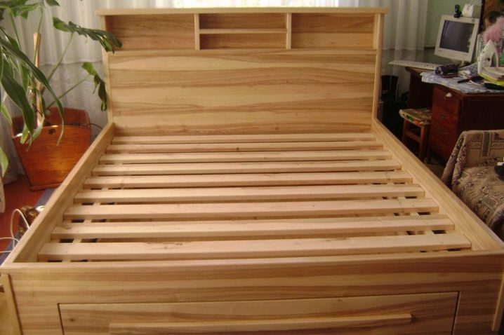 Nach diesen einfachen Manipulationen müssen Sie die unteren Lamellen fixieren. Diese Phase hängt auch davon ab, welches Material ursprünglich ausgewählt wurde. Heute können Sie in Baumärkten fertige, verarbeitete Lamellen in der gewünschten Länge kaufen, sie sind billig, aber sie reduzieren die Zeit, die für die Herstellung von Möbeln benötigt wird. Außerdem können Sie ein dünnes Brett in der richtigen Menge kaufen, aber dann muss es sich mit seiner Verarbeitung selbständig beschäftigen.