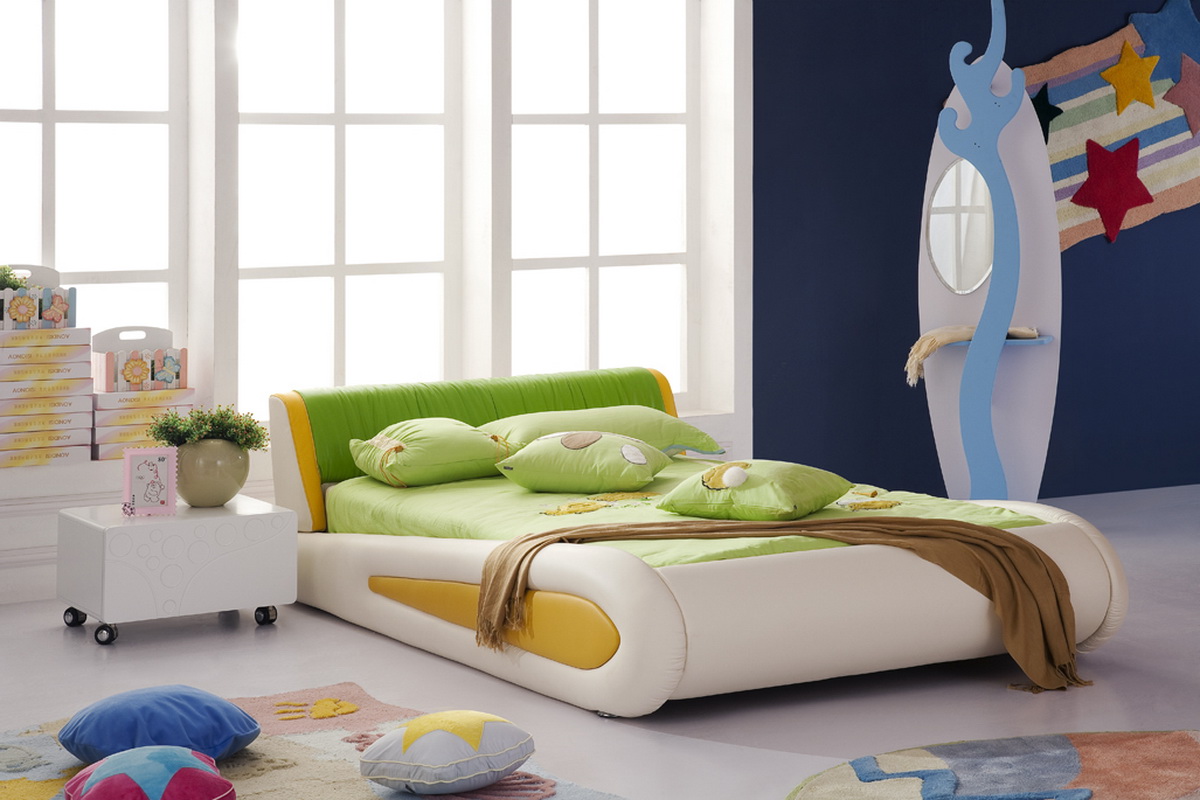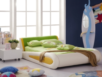 Kinderbetten funktionieren auch mit Öko-Leder, umweltfreundlich, hypoallergen und langlebiges Material. Solche Produkte werden in fröhlichen Farben hergestellt, oft mit einem lustigen Muster. In einem solchen Bett hat das Baby keine Angst vor Monstern. Stark, weich und massiv, steht es auf dem Schutz des gesunden Schlafes - wie ein Schild.