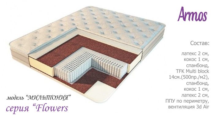 Die russische Firma Armos-Block ist seit mehr als 10 Jahren auf die Herstellung von Matratzen und anderen Schlafaccessoires spezialisiert. Alle Materialien, die in der Herstellung verwendet werden, einschließlich Bonnel- und TFK-Federblöcken, sowie gesteppte Stoffe, Fäden und anderes Zubehör werden von der Firma selbst hergestellt.