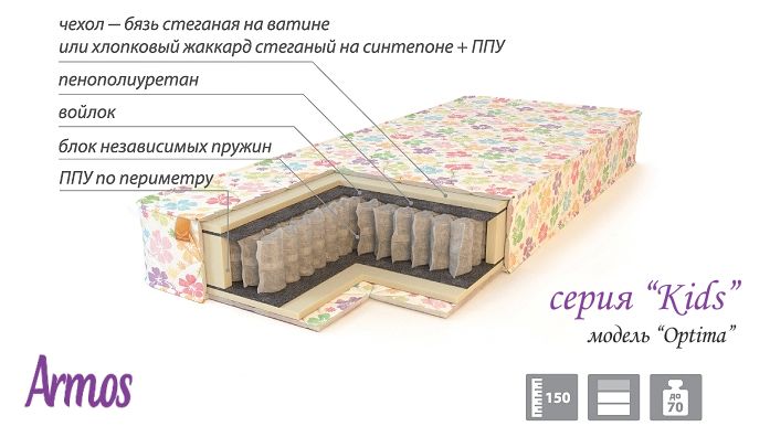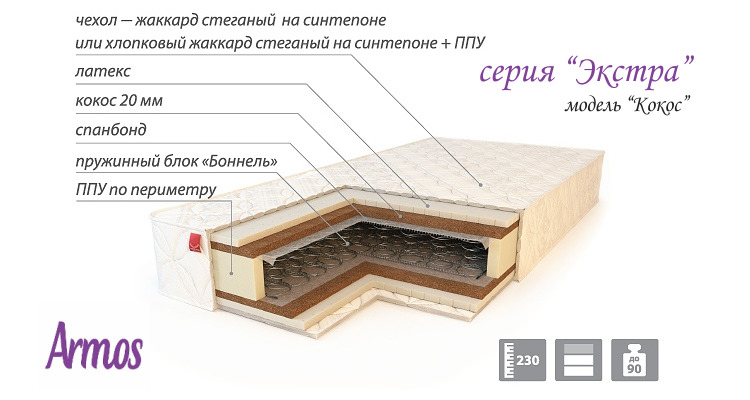 Das Armos-Sortiment umfasst preisgünstige klassische Modelle und High-Tech-Matratzen, für deren Herstellung hochwertige Materialien verwendet werden - Kokosnuss, orthopädischer Schaum, Polyurethanschaum,Spunbond, Strickwaren mit 3D-Mesh und anderen. Produkte sind für Menschen verschiedener Alters- und Gewichtsklassen konzipiert. Eine Vielzahl von Modellen ermöglicht die Auswahl einer Matratze, die allen Anforderungen gerecht wird, von medizinischen Indikationen bis hin zum Budget.