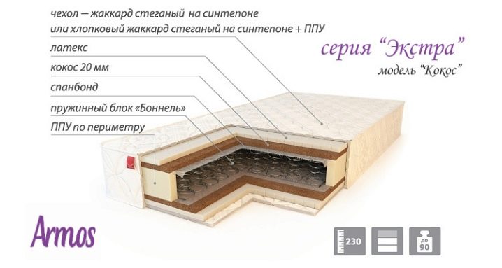 - Serie "Extra". Alle Matratzen dieser Serie sind orthopädische, hohe oder mittlere Härte, hergestellt auf der Basis der Bonnel-abhängigen Federeinheit (mit Rahmen). Insgesamt 7 Modelle in der Serie: "Ideal", "Sonnet", "Lux", "Amulett", "Grand", "Coco", "Season". Die Preisspanne beträgt 2800 Rubel. bis zu 7.500 Rubel., Grundsätzlich hängen die Kosten von der Matratze Füllstoff.