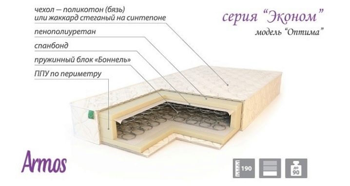 - Serie "Economy". Der Name der Serie spricht für sich - er enthält klassische Modelle, deren Preis 2500 Rubel nicht übersteigt. Sie alle sind auf Basis der Bonnel-Federeinheit gefertigt und eignen sich für den Einsatz zu Hause, auf dem Land und in verschiedenen Einrichtungen - Sanatorien oder Hotels. Die Serie umfasst Modelle "Economy", "Optima", "Standard", "Komfort", "Komfort verbessert", "Classic", "Provence", "Prestige", "Sommer Resident". Die Lebensdauer der Produkte beträgt 5 Jahre, die maximale Belastung beträgt bis zu 100 kg (bei verstärkten Modellen bis zu 120 kg).
