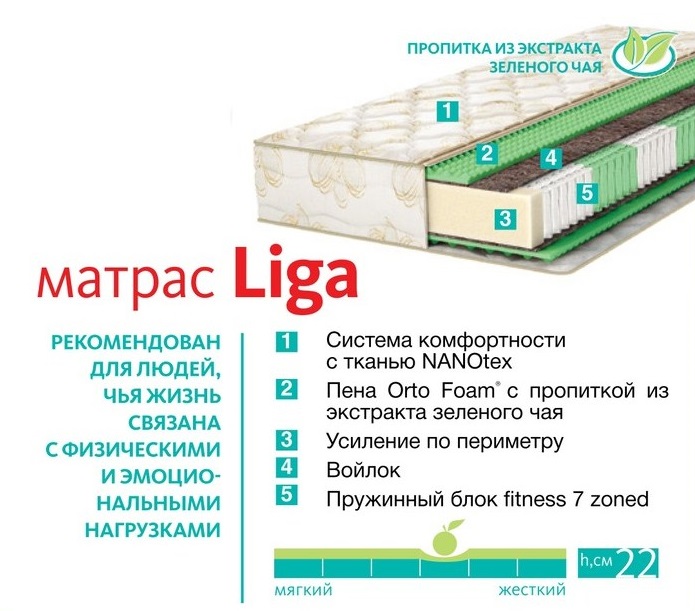 - "Liga". Entworfen für diejenigen, die sich ihr Leben ohne Sport nicht vorstellen können, oder einfach nur viel und aktiv arbeiten, ständig in Bewegung sind. Diese Matratze ist mit einer einzigartigen Massage-Schicht ausgestattet, die den Muskeln des ganzen Körpers hilft, sich nach einem anstrengenden Tag zu entspannen;