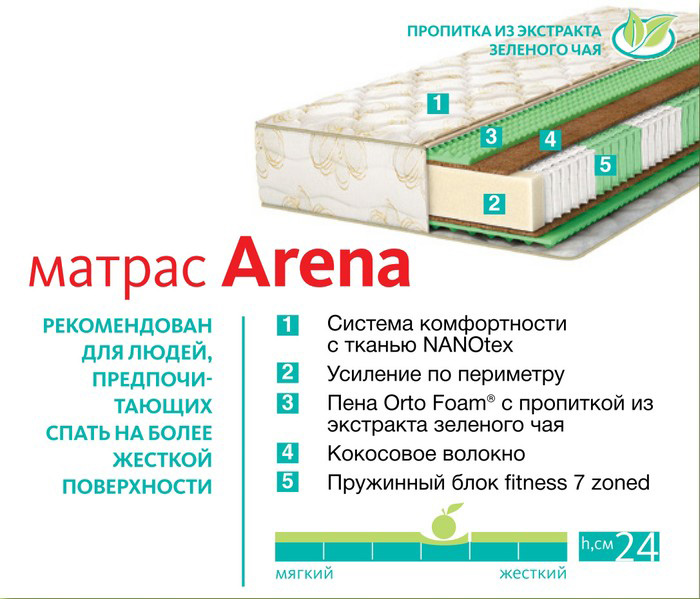 - "Arena". Es hat anatomische Form und mittlere Steifigkeit. Der Füllstoff ist Kokosblatt. Es lässt Luft frei zirkulieren und verhindert Feuchtigkeitsbildung. Der Preis der Matratze ist ziemlich demokratisch. "Arena" ist geeignet für diejenigen, die sich auf einer festeren Oberfläche entspannen möchten;