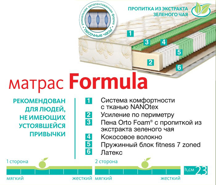 - "Formel". Die Matratze sorgt für die Selbsteinstellung der Steifigkeit. Auf der einen Seite ist es aus Latex, für Liebhaber von weichen Federbetten entwickelt, auf der anderen Seite hat es die gleiche Massage-Schicht wie "Liga". Sie können wählen, auf welcher Seite Sie schlafen, um sich zu erholen und Ihren neuen Tag in bester Stimmung zu verbringen.