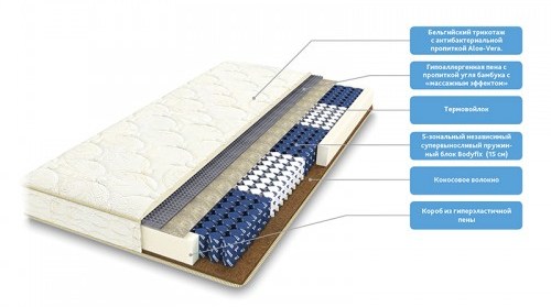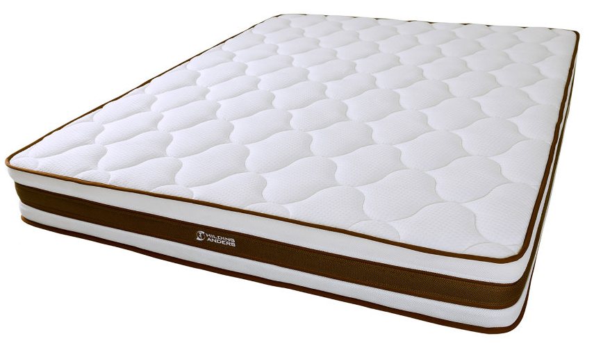 - Relativ kostengünstige anatomische Matratze "Hilding Linienmodus" 18 cm hoch sind bis zu fünf Schichten an der Basis: Schaum imprägniert mit Bambuskohle, eine Schicht Kokosfaser, Bodyfix Federn, ein Thermofilz und eine weitere Schaumschicht um den Umfang herum.