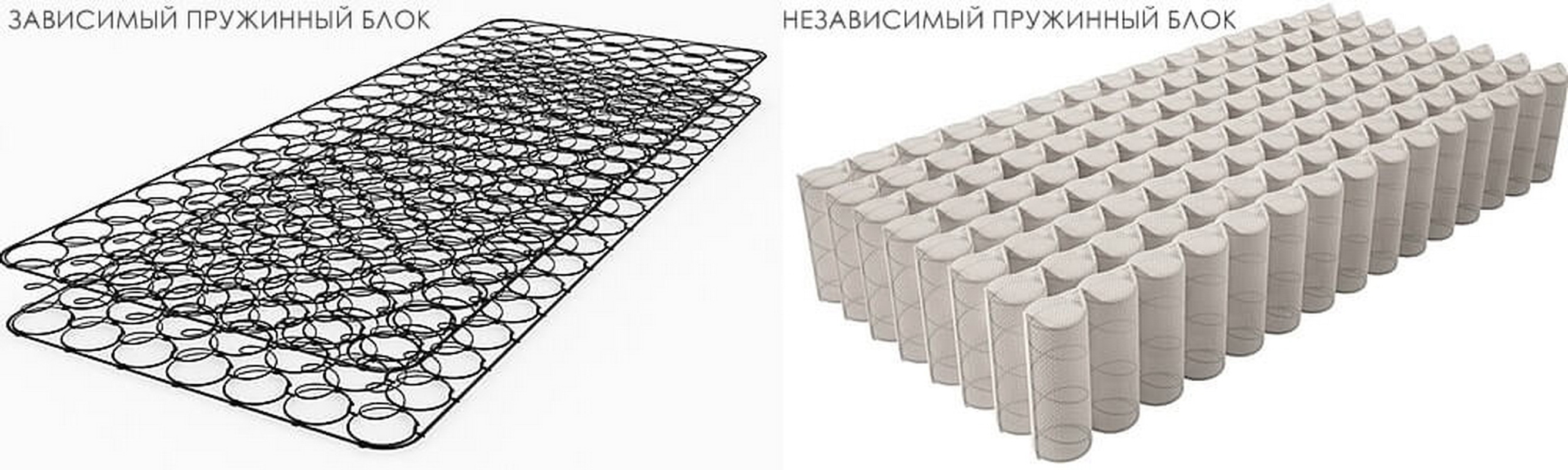 - Abhängig - In ihnen sind die Federn miteinander verbunden. Der berühmteste von ihnen ist der Bonnel Block. Diese Option ist billig, aber das Niveau der orthopädischen Wirkung ist gering. Es ist gut geeignet für ein Gäste- oder Cottage-Bett, sowie in der Wohnung, die Sie mieten müssen.