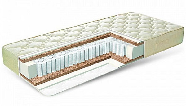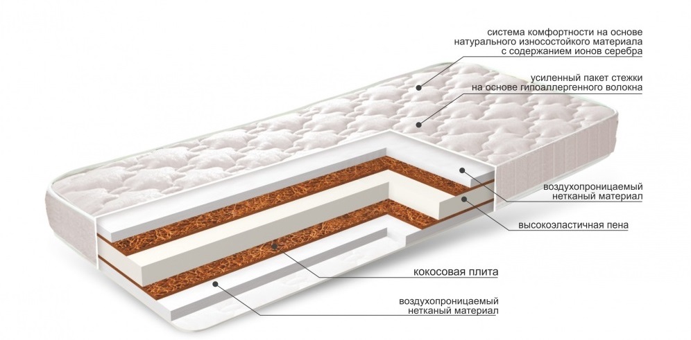 - Kokos Kokos. Natürliches Material, das die Steifigkeit der Matratze gewährleistet. Dieser Füller passt perfekt Luft, verursacht keine Allergie, ist feuchtigkeitsdicht. Er nimmt die Last perfekt wahr, überträgt sie auf die Federeinheit, unterstützt die Wirbelsäule, stellt schnell ihre ursprüngliche Form wieder her. Darüber hinaus macht eine lange Lebensdauer dieses Füllmaterial in orthopädischen Matratzen unverzichtbar.