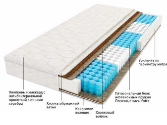 Die wichtigste Komponente der Matratze ist ihre "Füllung". Der Füller bestimmt die Steifigkeit des Modells und Bequemlichkeit und Lebensdauer hängen direkt von seinen Eigenschaften und seiner Qualität ab. Rohstoffe für Füllstoffe sind sehr vielfältig, aber die wichtigsten werden Naturlatex, Kokos Kokos, behandelt Filz, Wolle, Baumwolle, Memory-Schaum.