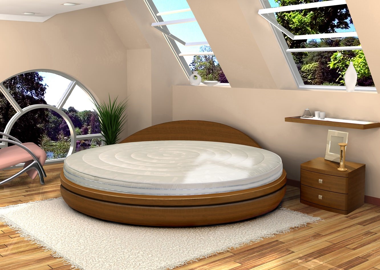 Die Form der Matratze, zusätzlich zu den üblichen rechteckigen, kann rund sein, was eine sehr stilvolle und ungewöhnliche Innenlösung ist. Eine runde Matratze ist in ihren orthopädischen Eigenschaften rechteckigen Modellen nicht unterlegen.