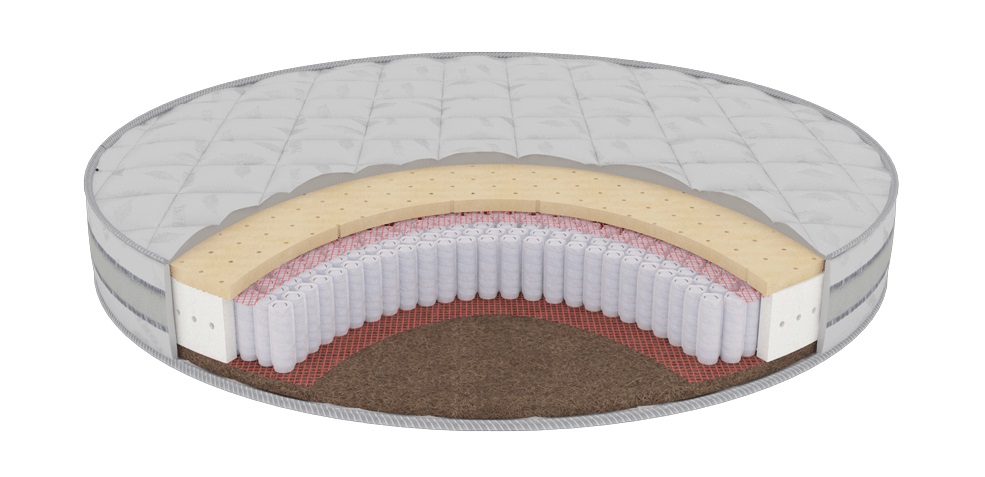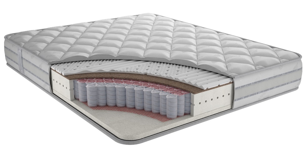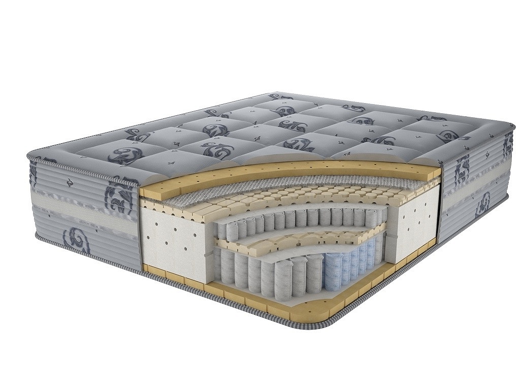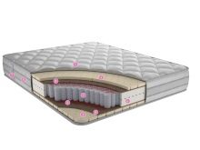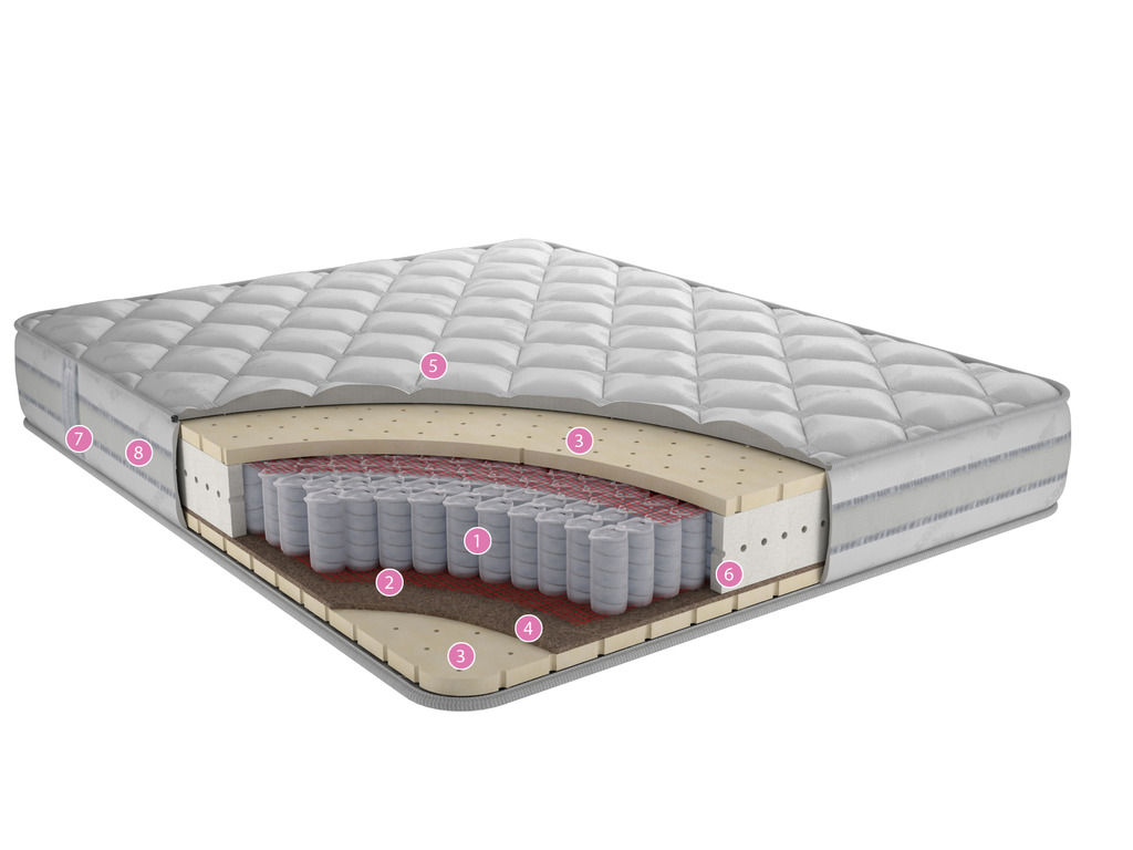 Der Vorteil dieses Modells ist ein Schutzschirm, der die Lebensdauer des Produkts verlängert. Im Inneren befindet sich neben dem Federblock mit sieben unabhängigen Zonen eine Schicht aus Latex und hochelastischem Schaum mit einer Erinnerung an die Form des Körpers.