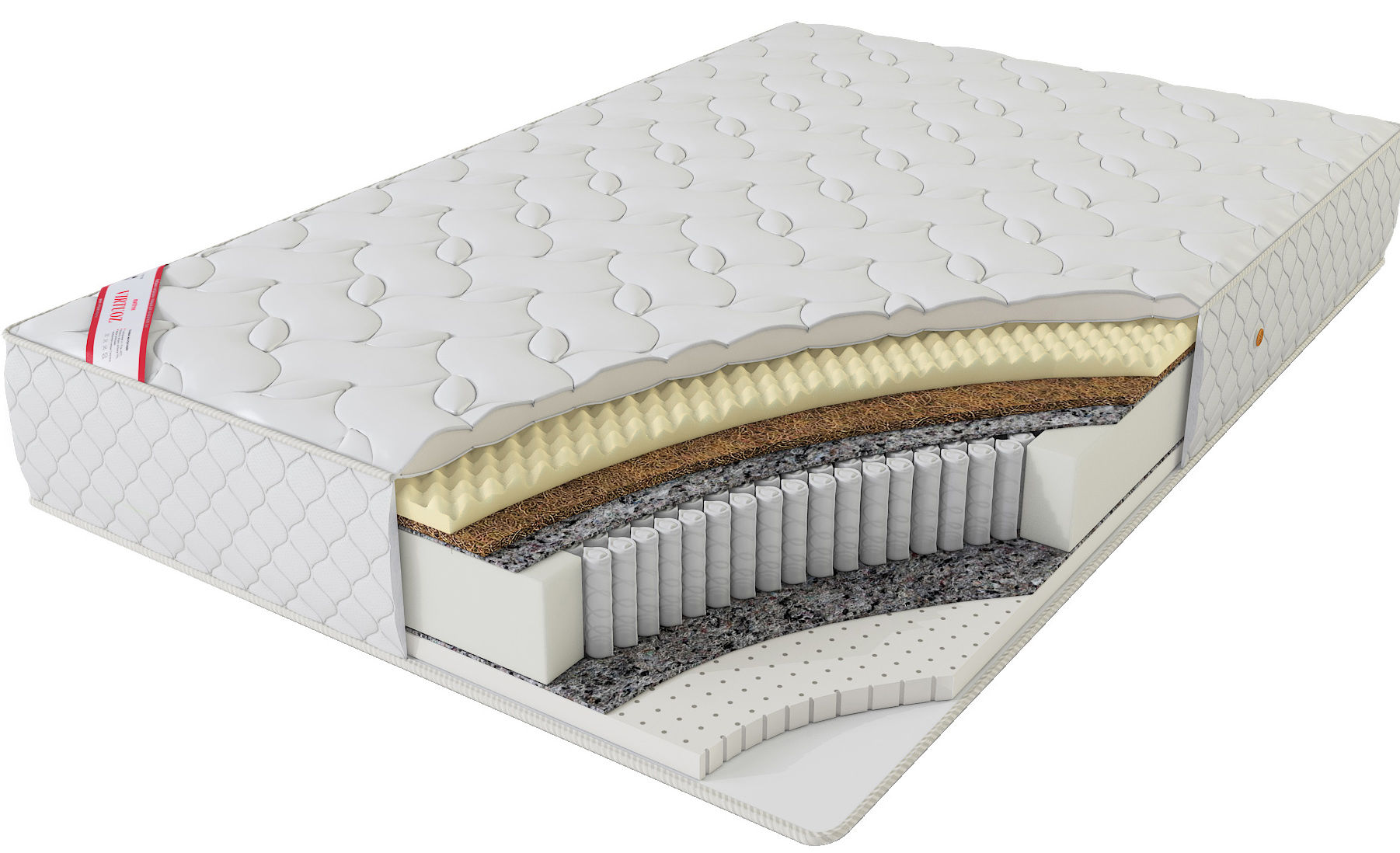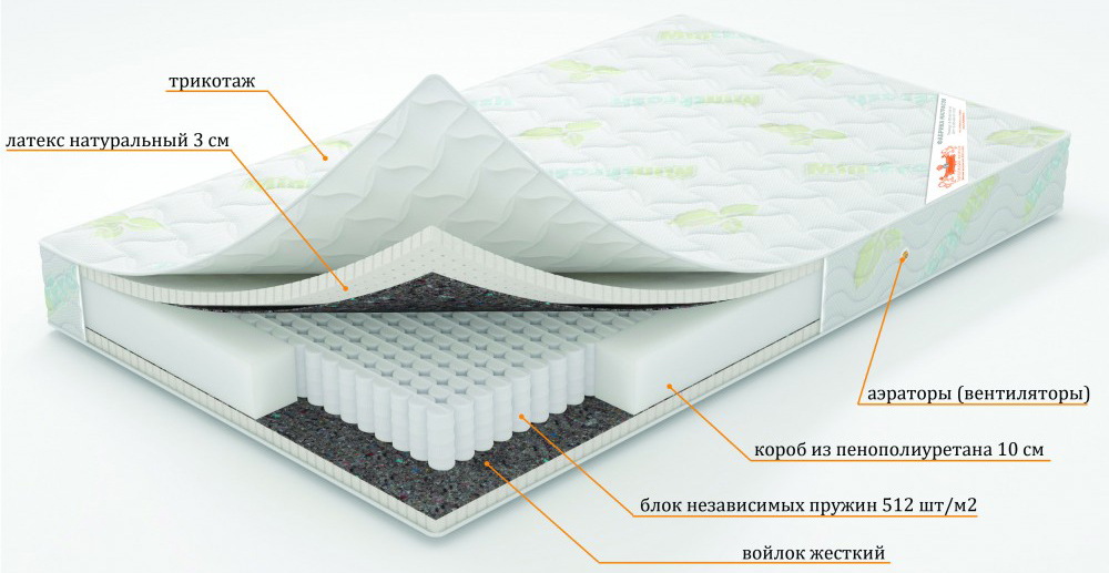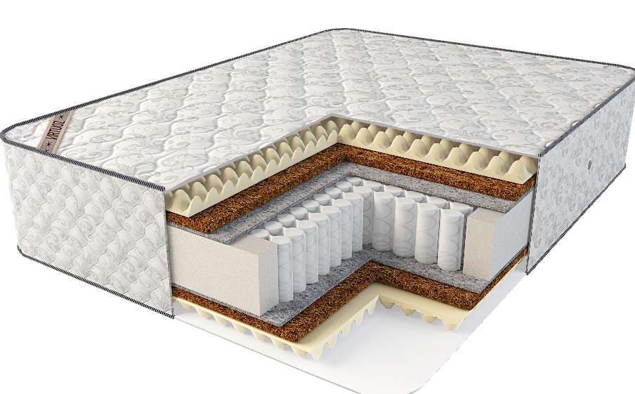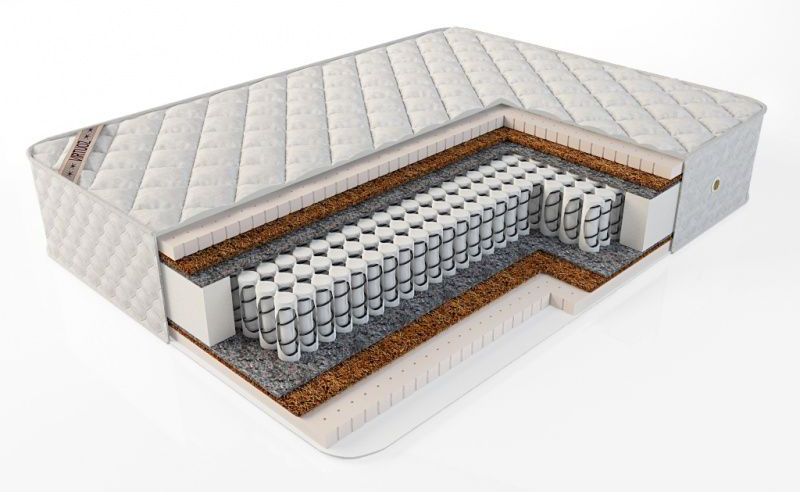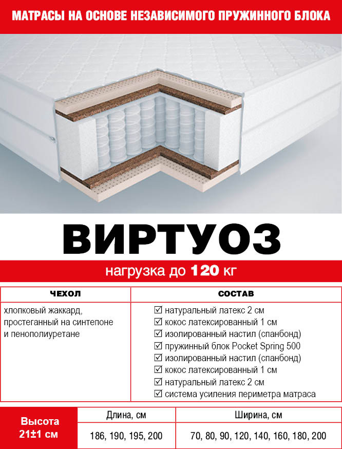 Über den Federn befindet sich eine Isolierschicht aus Filz. Dies verlängert die Lebensdauer des Produkts und schützt es vor Reibung. Von den Füllstoffen in den Matratzenprodukten verwendet Virtuoz natürliche und künstliche Materialien.