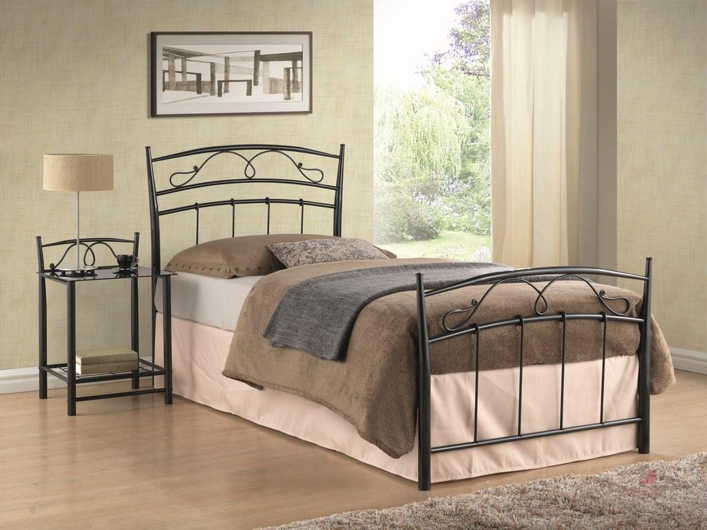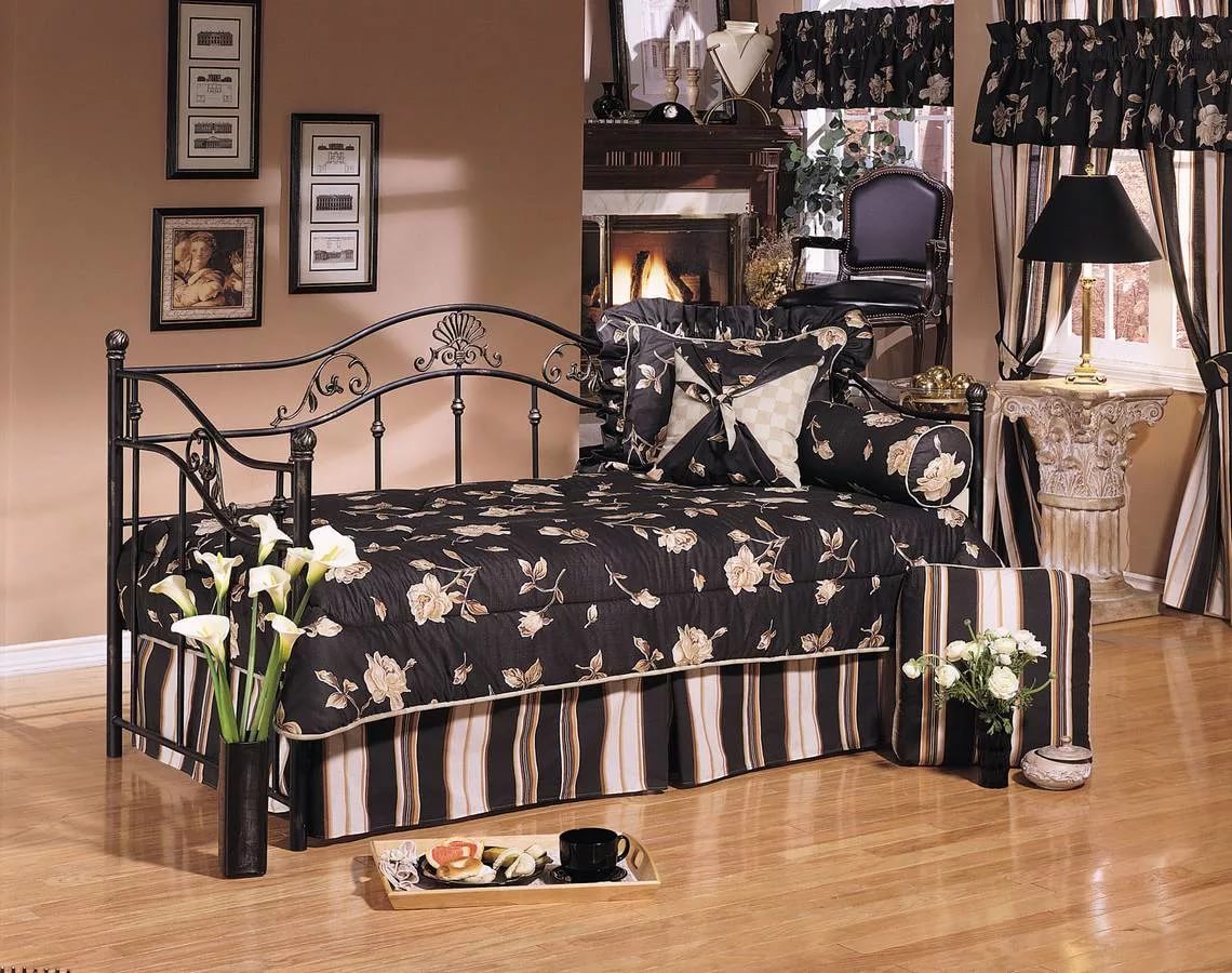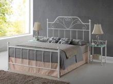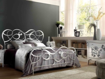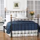 Metallbetten sind in verschiedenen Farben und Farbtönen erhältlich.Nicht nur Standardbronze, Silber und Gold sind beliebt. Ein weißes oder schwarzes schmiedeeisernes Bett kann sehr harmonisch in das Innere eingeschrieben werden, besonders wenn diese Farben mit interessanten dekorativen Elementen verdünnt werden.