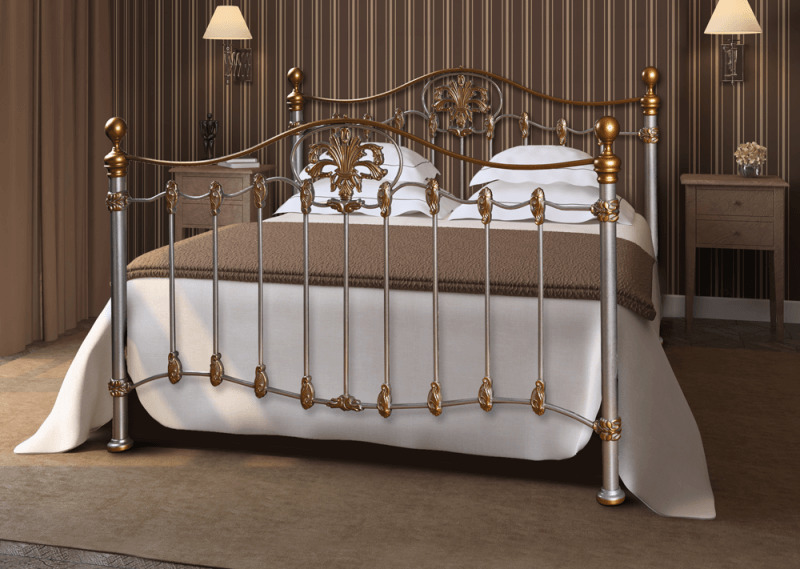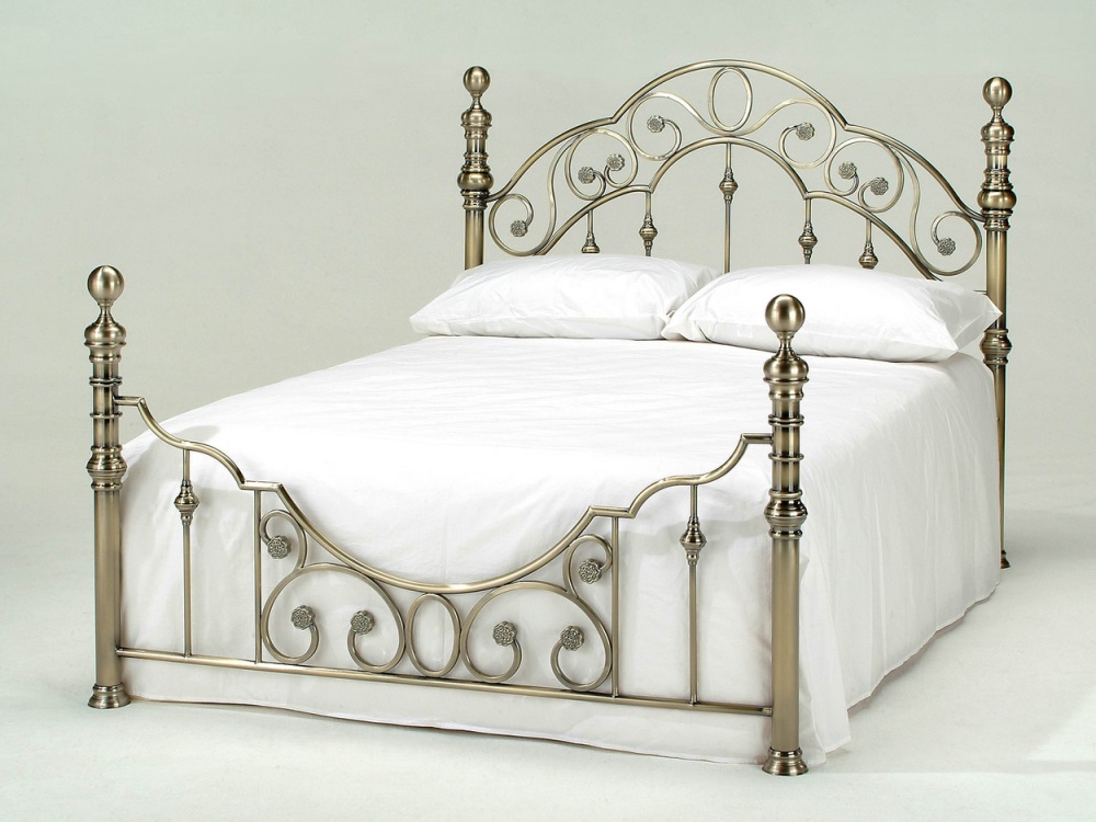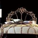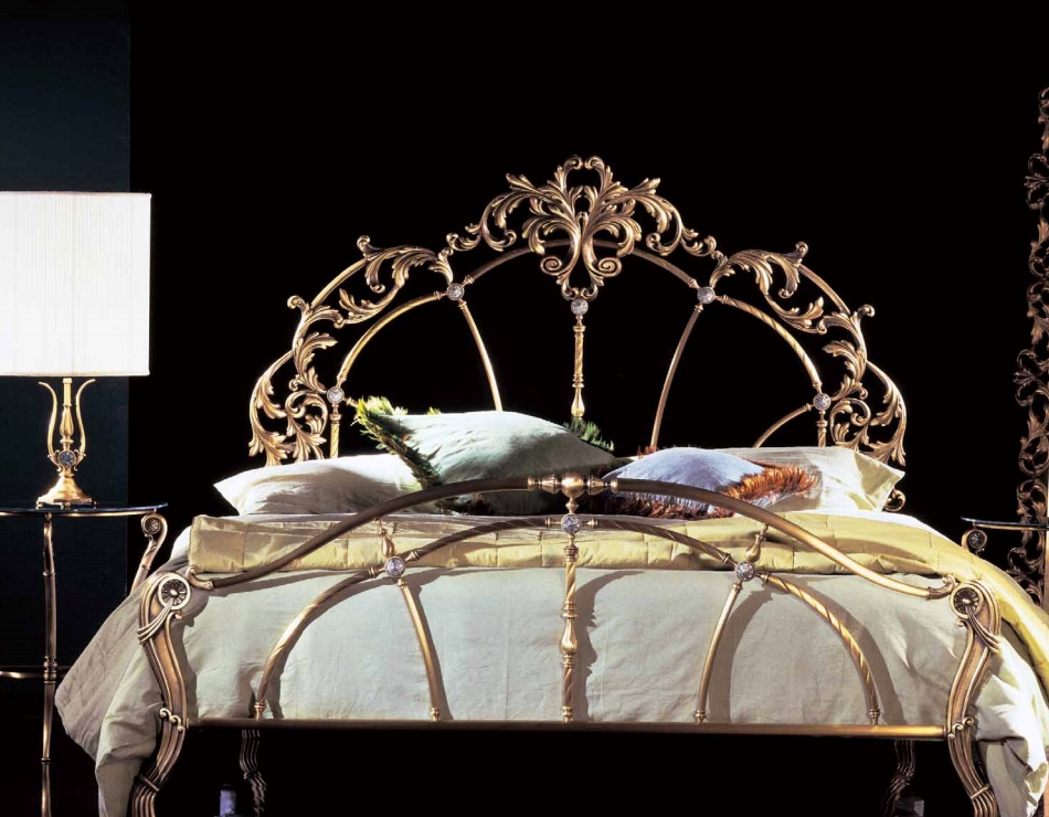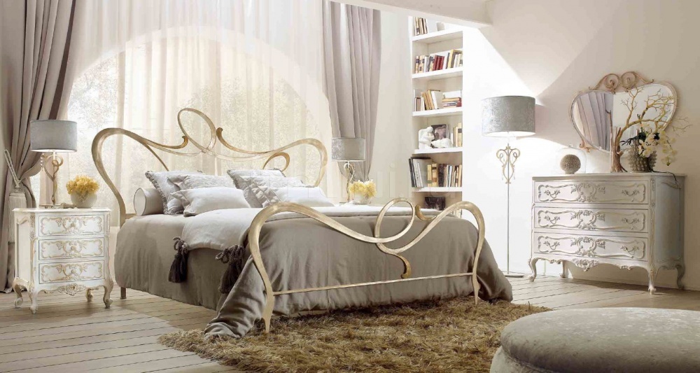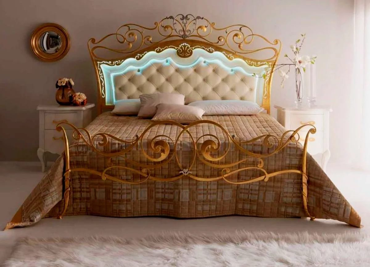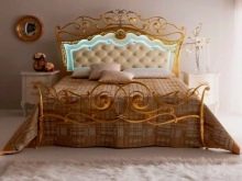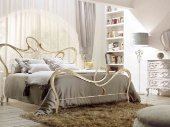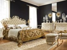 Betten aus Edelmetallfarben passen am besten hinein Barock, Rokoko, Art Deco, klassische Innenräume. Das Bett, ergänzt mit schmiedeeisernen Elementen, wird vor dem Hintergrund teur luxuriöser Möbel einen hervorragenden Akzent setzen. Achten Sie in diesem Fall auf die Bettdecke.Der Effekt alter Farbe für die aufgeführten Stile funktioniert nicht.