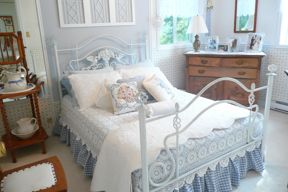 Diese Innenräume sind im provenzalischen Stil gehalten. Beachten Sie, wie sich die Eisenbetten harmonisch in die Einrichtung einfügen. Weiße Farbe als Priorität wird nicht zufällig gewählt. Es erlaubt Ihnen, dem Raum eine Atmosphäre von Leichtigkeit, Leichtigkeit und Einfachheit zu geben.