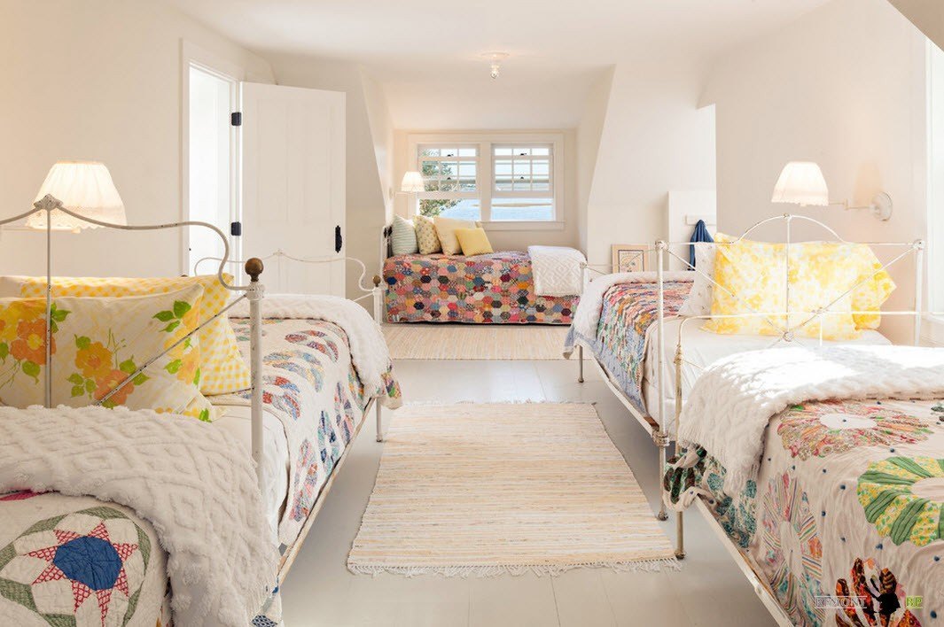Das Beispiel zeigt einen Innenraum, in dem mehrere Eisenmodelle gleichzeitig sind. Ein solcher Kindergarten ist sowohl für Jungen als auch für Mädchen geeignet.. Auch hier ermöglicht die helle Farbe der Betten, die Illusion von erweitertem Raum visuell zu erzeugen. Eisenbetten helfen in vielerlei Hinsicht, den Platzmangel zu bewältigen, weil sie optisch nicht so schwerfällig wie Holz wirken.