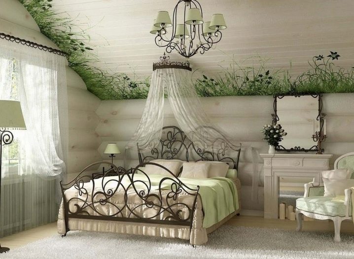 Kunstschmieden sieht sehr interessant aus. bei der Registrierung der Betten mit dem Baldachin. Zum Beispiel spiegelt in diesem speziellen Fall das Dekor des Betts die Hauptidee des Öko-Interieurs wider und fungiert gleichzeitig als Hauptakzent des Raumes.