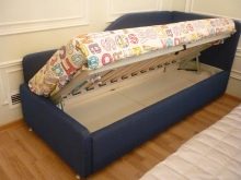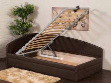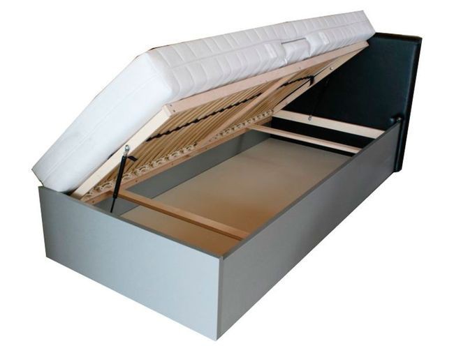 Ein Einzelbett mit einem Hebemechanismus ist sehr komfortabel zum Schlafen und Entspannen und vor allem - es ist mit einer speziellen großen Nische ausgestattet, in der Sie Ihre persönlichen Sachen aufbewahren können. So können Sie in den Schränken und Kommoden in einer kleinen Wohnung deutlich Platz sparen.