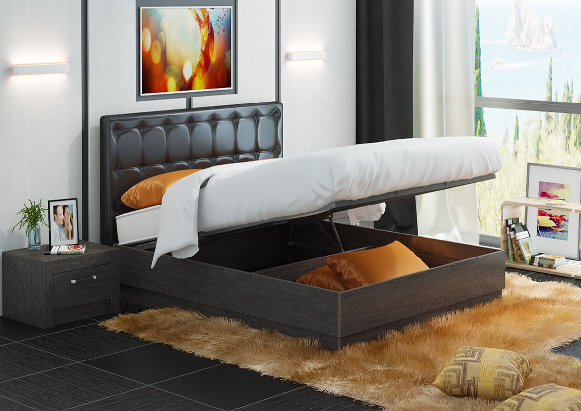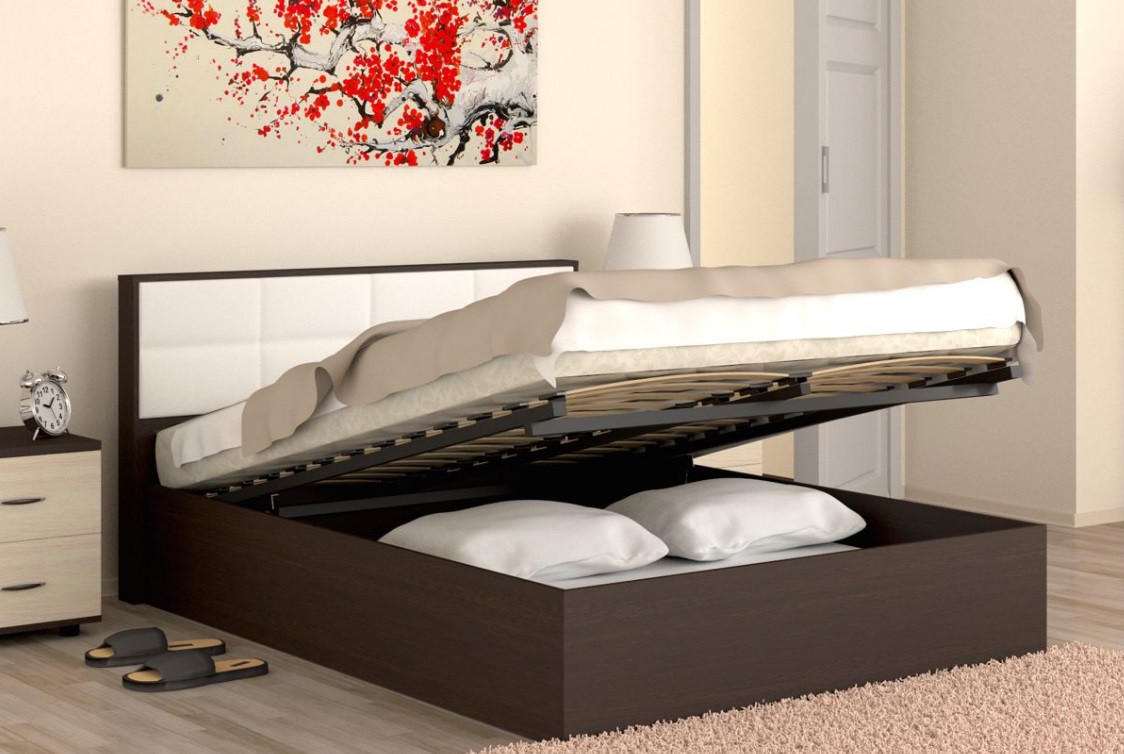 - Funktionalität Viele Lederbetten sind mit einem Hebemechanismus ausgestattet. Es bietet Zugang zu einem geräumigen Innenfach. Darin können Sie Kissen, Decken und Bettzeug aufbewahren, Platz sparen und eine gepflegte Umgebung beibehalten. Spezielle Mechanismen ermöglichen ein müheloses Anheben und Absenken der Matratze ohne Anstrengung.