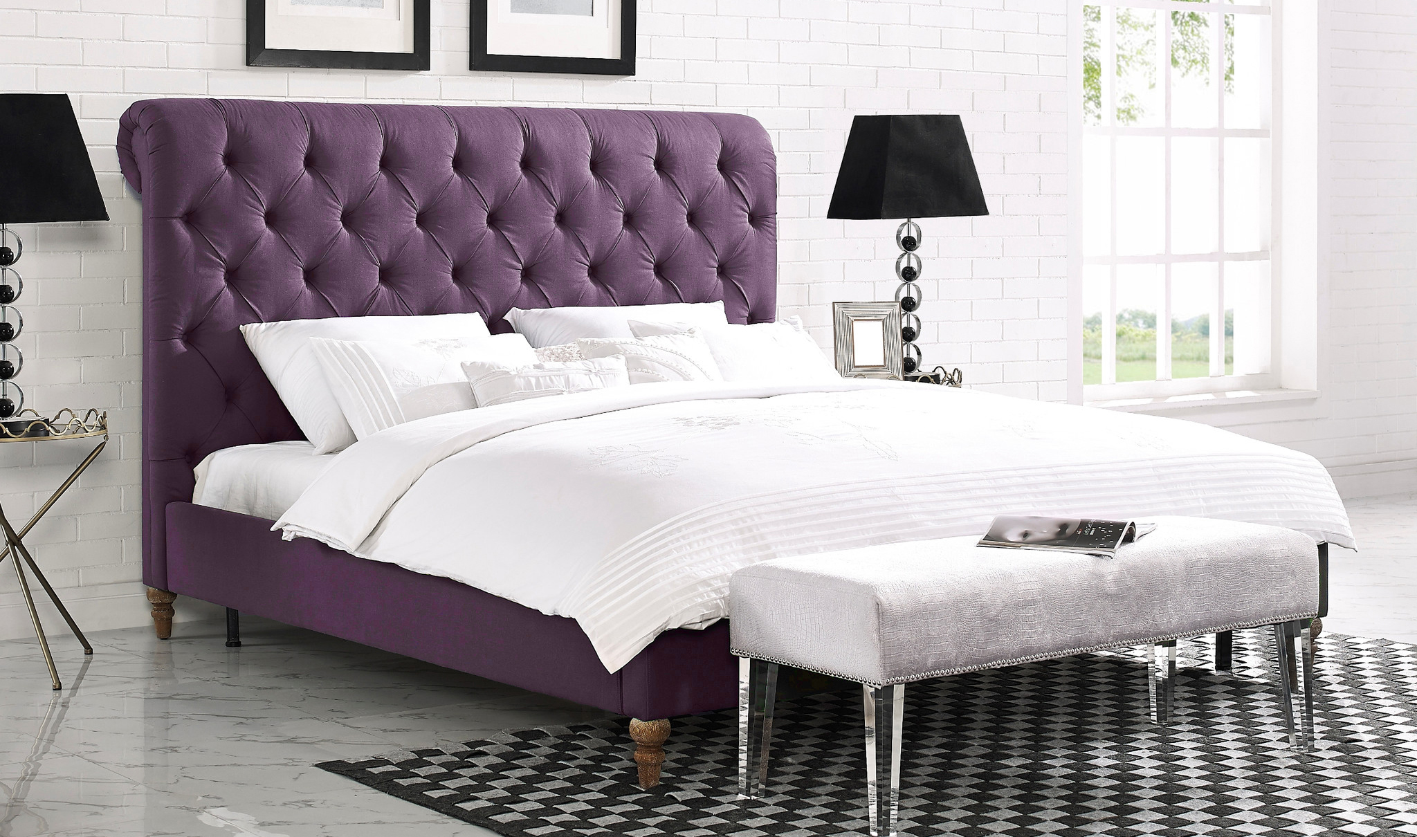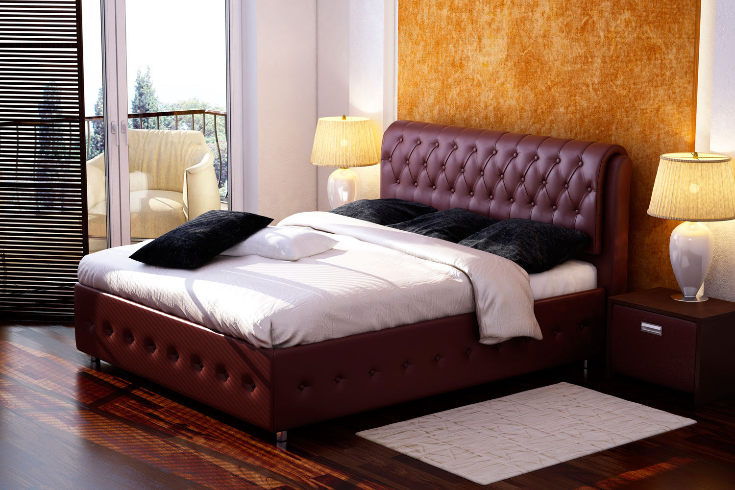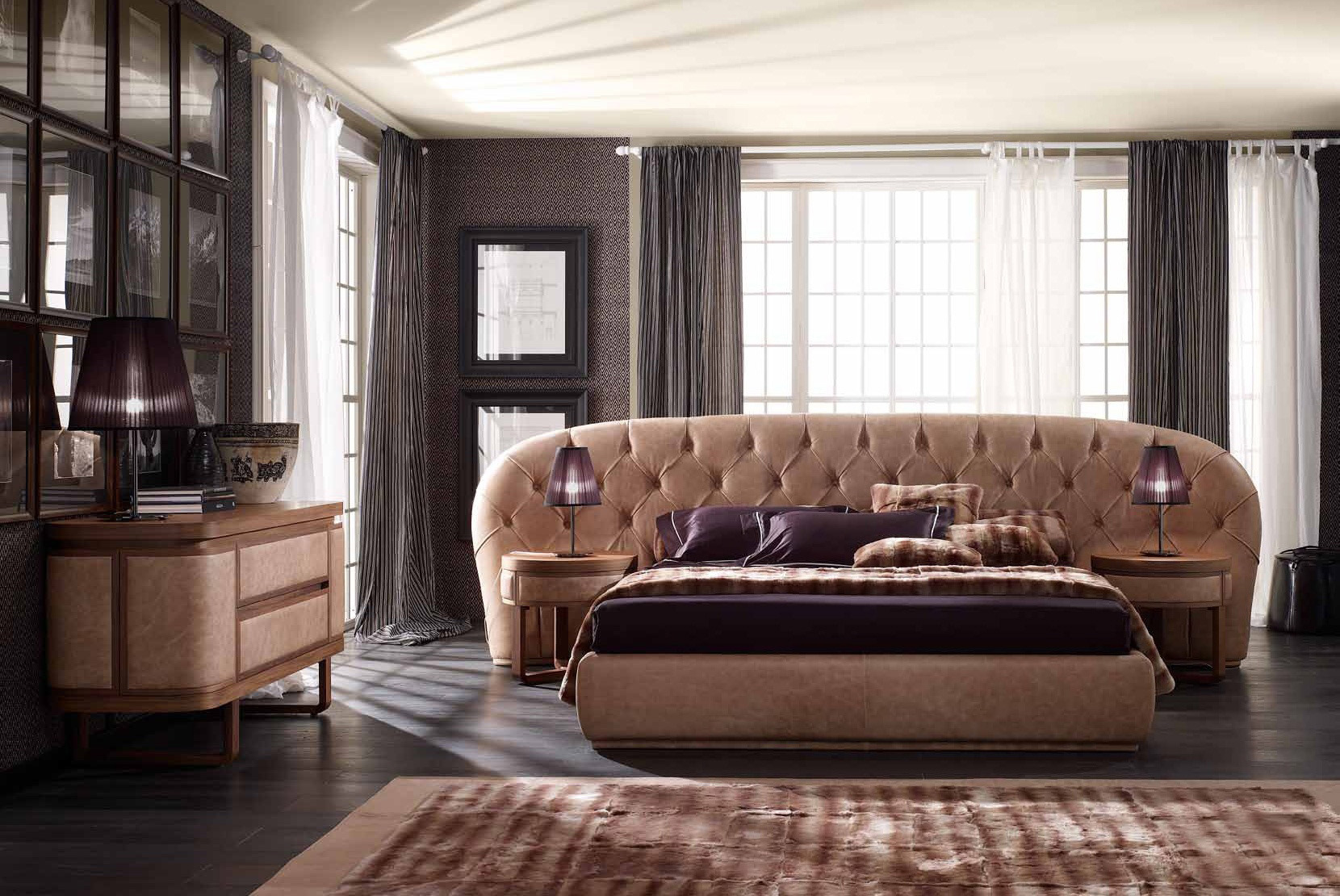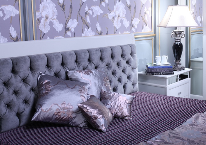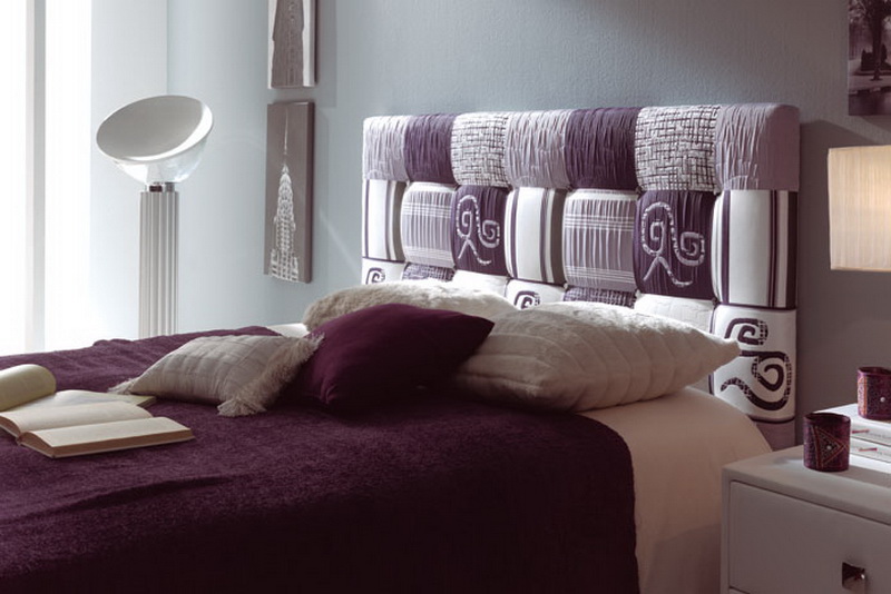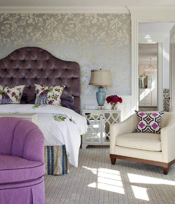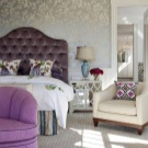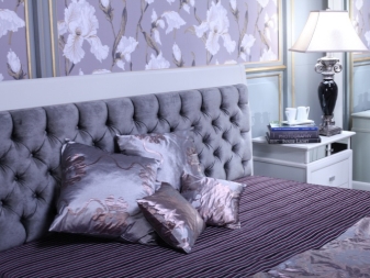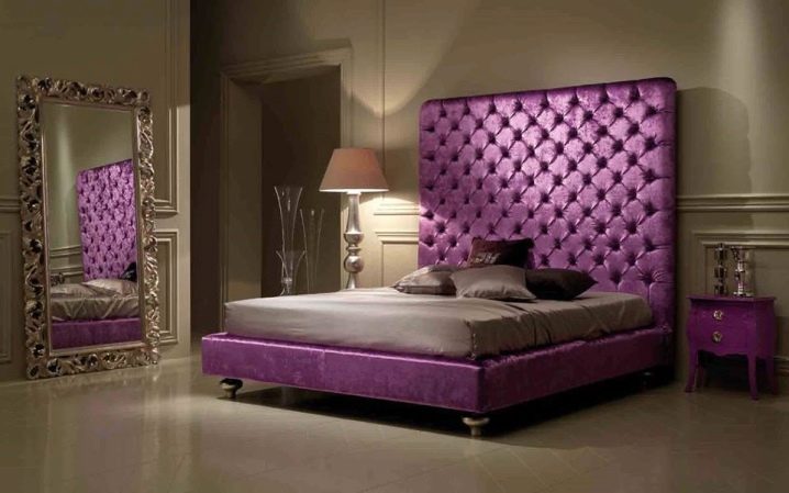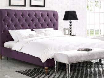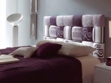 Ein Bett mit einem hohen Kopfteil sieht königlich luxuriös aus, wenn es groß, breit und ungewöhnlich ist. Lila Farbe in der Dekoration des Schlafzimmers sieht kalt und nicht immer angemessen, aber im Falle eines lila Rücken ist eine Ausnahme. Beachten Sie, wie gut die halbrunde Form und tiefe Schatten, Samt und große dekorative Knöpfe im Finish.