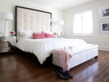 - Akzent, der den Raum einstellt. Der weiche Rücken kann der Hauptkontrast im Schlafzimmer sein und seine Stilrichtung bestimmen. Barock und Rokoko zum Beispiel zeichnen sich durch hohe Mauern und ihre luxuriösen Ausführungen aus, in denen Burgunder, Rot, Schwarz und Gold dominieren. Es ist unvorstellbar, diese Trends ohne eine aufwendige und komplexe Form vorzustellen. Der lakonische und zurückhaltende Klassiker bevorzugt ein rechteckiges Kopfteil, mäßig groß und in ruhigen Farben. Und selbst die moderne Moderne kann ohne einen durchschnittlichen weichen Rücken nicht vorgestellt werden;