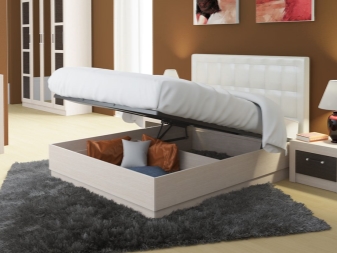 Das Kopfteil kann nicht nur eine Dekoration des Innenraums sein, sondern auch seine funktionelle Komponente: ein Beleuchtungssystem, offene Regale oder Speicherplatten, ein Mechanismus zum Senken und Anheben. Modelle mit einem anhebbaren oder herausnehmbaren Kopfteil sind in Bezug auf Komfort und Pflege praktisch - es ist einfach, den Rücken bei Verschmutzung trocken zu reinigen oder den angenehmen Winkel bei Bedarf anzupassen. Betten mit einem hohen Kopfteil dienen eher als Innendekoration, und wenn wir über Komfort sprechen, dann wird es Modellen mit einem niedrigen und breiten Rücken präsentiert - es ist angenehm, sich darauf zu lehnen. Die Betten können auf Beinen stehen oder haben eine Bodenbox.Diese Box kann wiederum mit Hilfe eines Hebemechanismus zurückgezogen oder geöffnet werden.