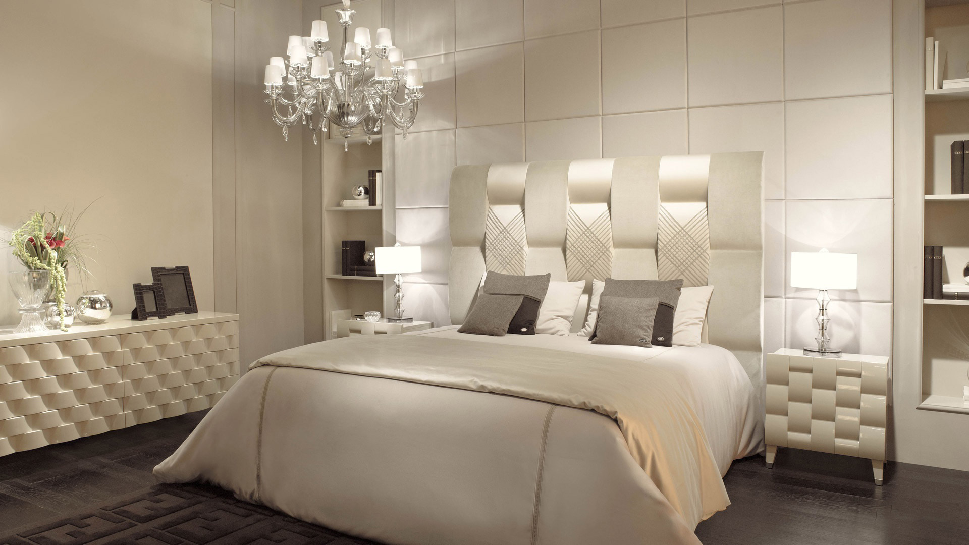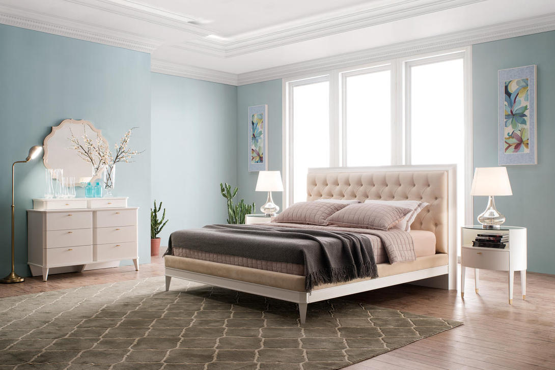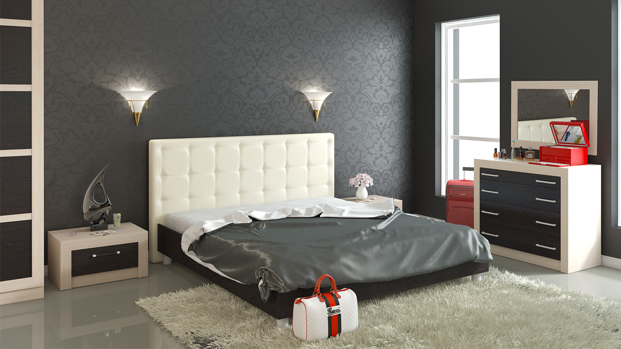 - Beige und seine hellen Farbtöne auch unter der Farbpalette von Möbeln üblich. Dieser Schirm sieht in der Dekoration von Natur- oder Öko-Leder in einem klassischen Schlafzimmerformat teuer aus.