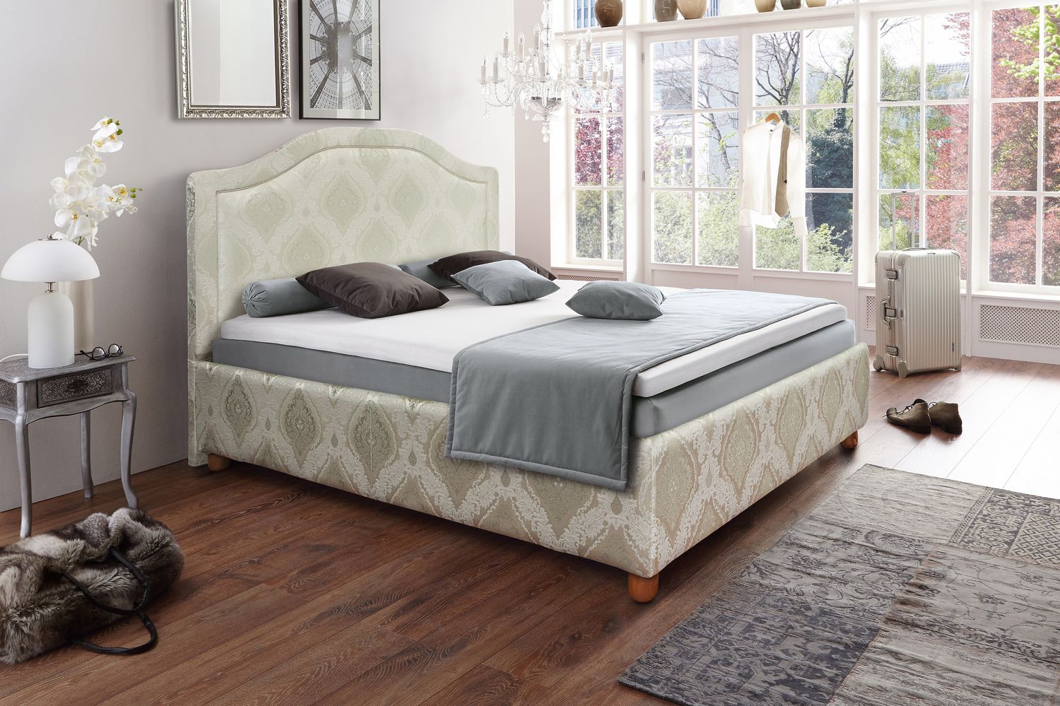 Betten mit einem Kopfteil aus Stoff sind fast so gut wie Modelle mit Leder, und die günstigste Option wäre, ein Bett mit Kunstlederbezug zu kaufen.