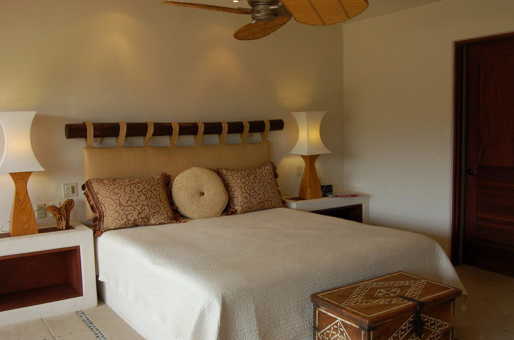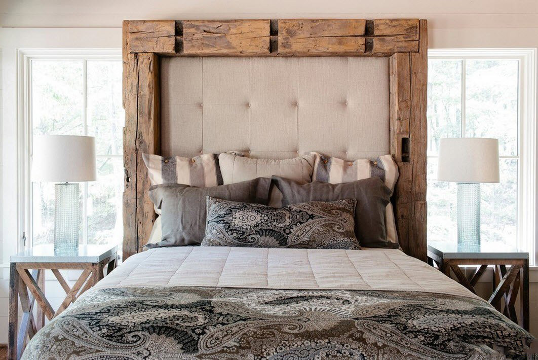 - Land Rustikale Einrichtung akzeptiert auch ein Bett mit einem weichen Rücken, während es nicht vollständig Textil sein sollte - lassen Sie Platz für einen Holzrahmen.