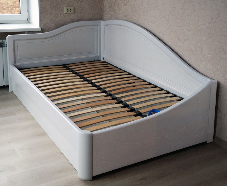 Eine sehr praktische Option ist das Eckmodell. Wenn Sie ein gerades Bett mit einem seitlichen Rücken in der Mitte der Wand nicht installieren können, verwenden Sie die Option Ecke. Es ist ideal in jeder Ecke des Schlafzimmers gelegen.