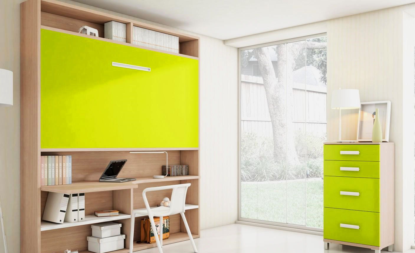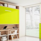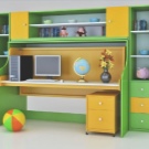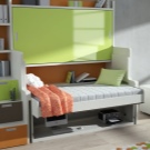 - Eine gute Option für schmale Zimmer kombiniert einen Schreibtisch und ein Bett. Die Möbel werden unter Berücksichtigung der Eigenschaften des Raumes ausgewählt.