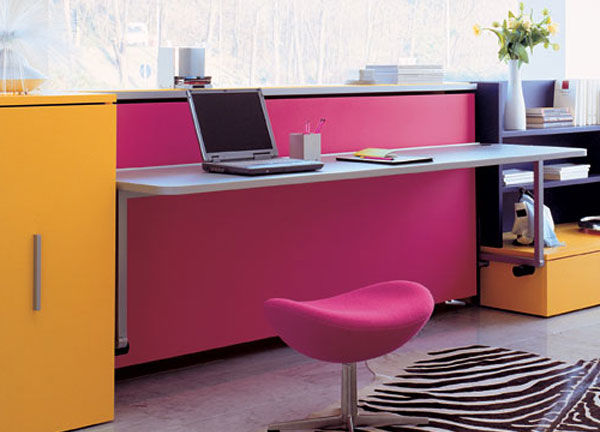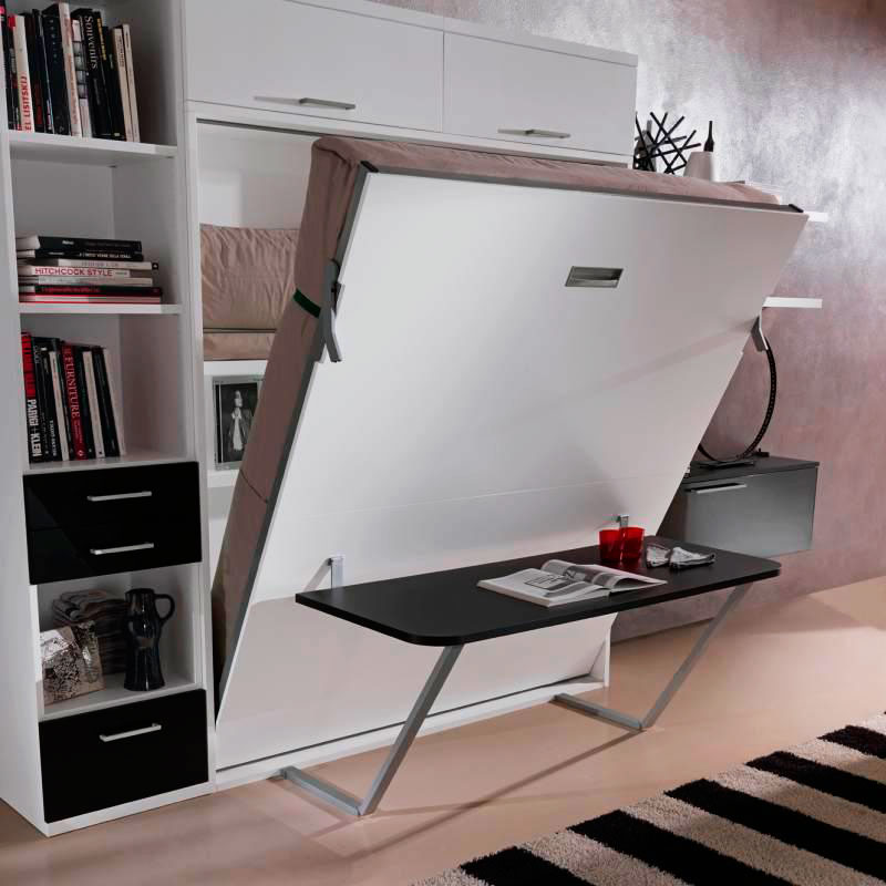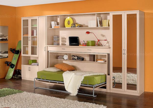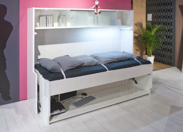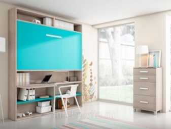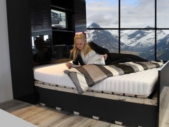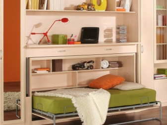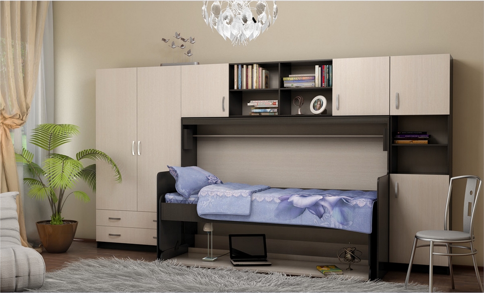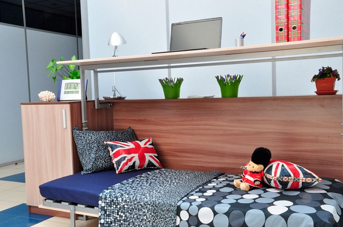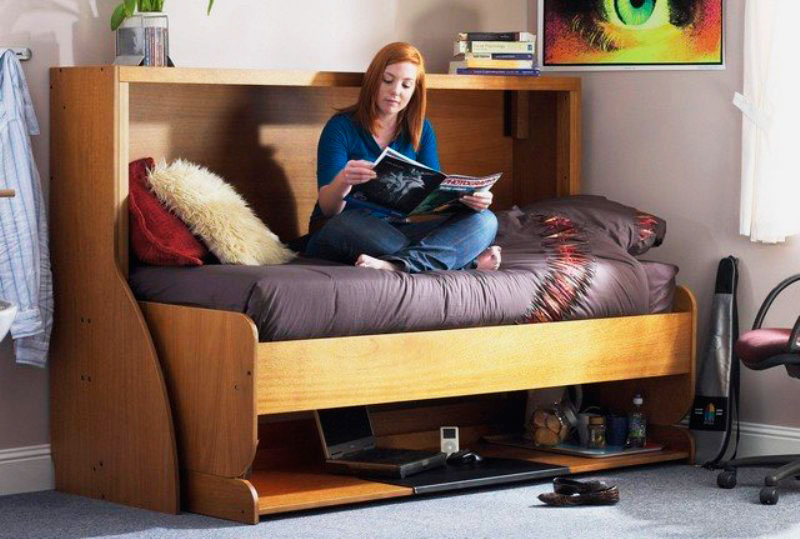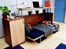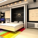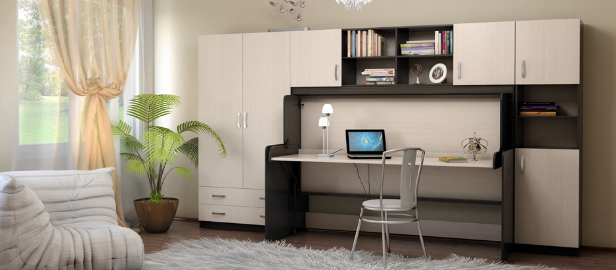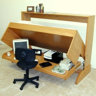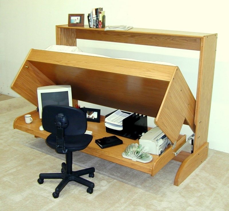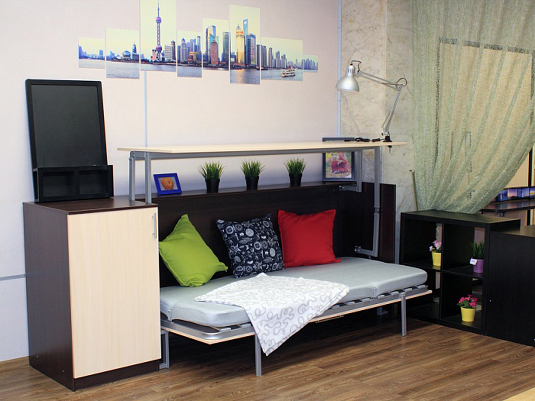 - Sie können ein Schlafzimmer, Wohnzimmer und Büro in einem Raum kombinieren. Betten - Transformatoren sind schnell auf den Tisch und umgekehrt, während es nicht notwendig ist, Dinge zu entfernen.