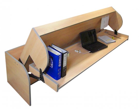 - Beim Aufklappen steigt die Arbeitsfläche an oder wird unter das Bett gestellt.