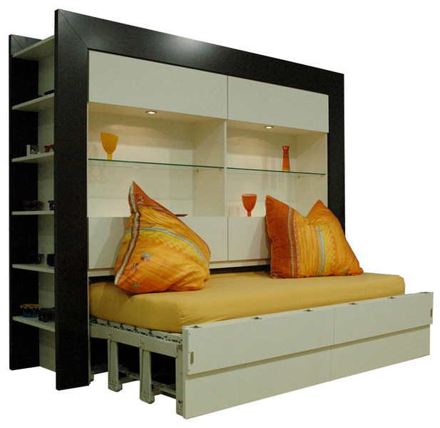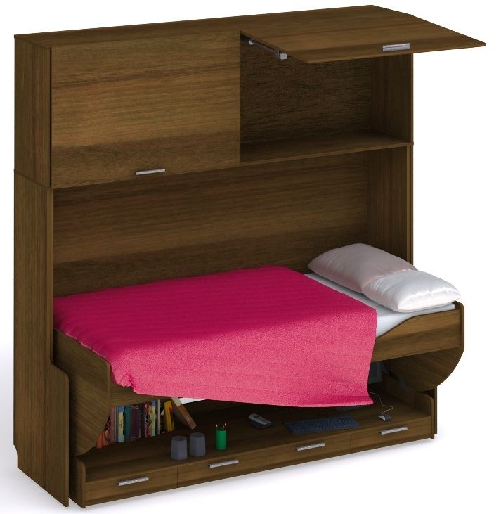 In heimischen Läden ist häufiger ein Doppelbett-Kleiderschrank. In der zusammengebauten Version wird das Bett durch Regale, einen Spiegel oder eine Bibliotheksimitation maskiert.