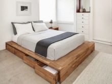 Dies ist das gängigste Bettmodell im modernen Loft-Stil. Der Liegeplatz befindet sich auf einem großen Ständer aus Paletten oder großen Brettern. In der Palette können Schubladen zur Aufbewahrung von Wäsche und anderen Dingen installiert werden. Praktische und stilvolle Option. Solche Möbel sind besser für geräumige Schlafzimmer zu wählen.