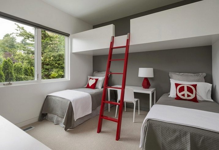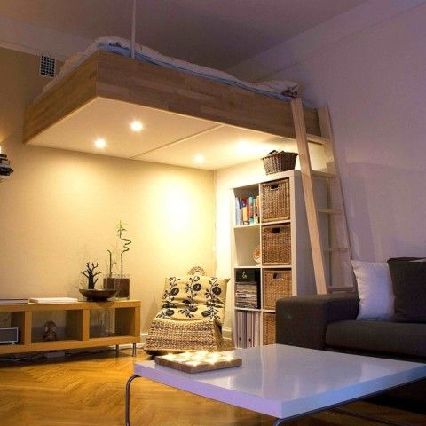 - Unter der Decke. Mit Hilfe eines speziellen Designs wird das Bett in den Ecken in einer bestimmten Höhe unter der Decke befestigt. Eine Leiter ist daran befestigt.