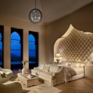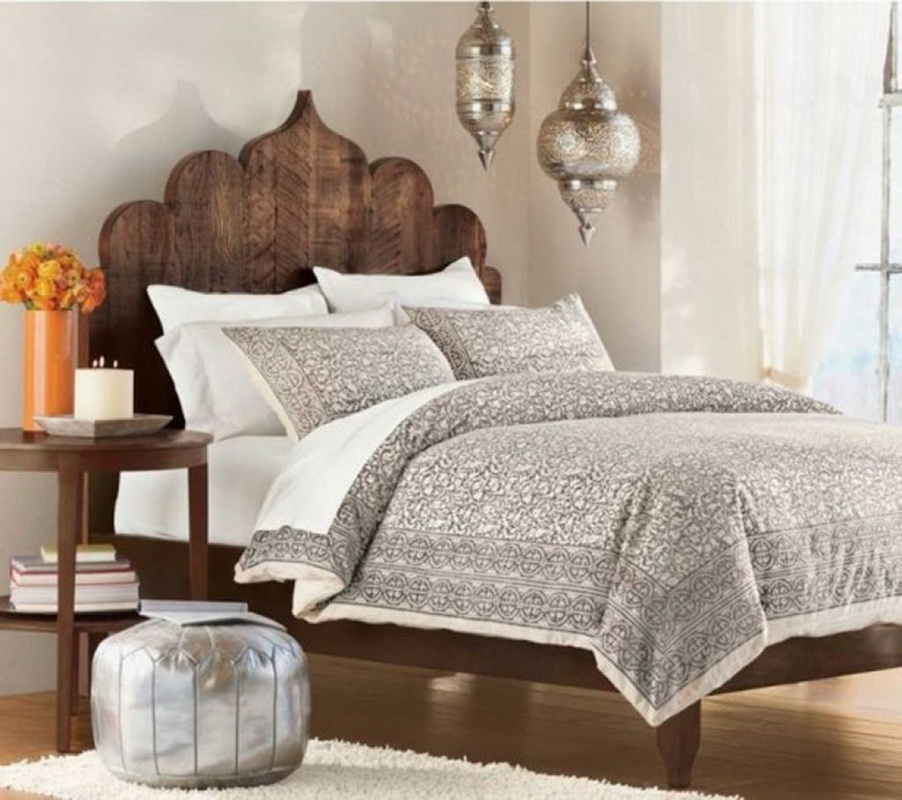 - Marokkanisch - Das Hauptelement ist das Bett. Es sollte mit einem Baldachin geschmückt sein oder ein spektakuläres Kopfteil haben. In den Ecken können schöne geschnitzte Pfosten platziert werden.