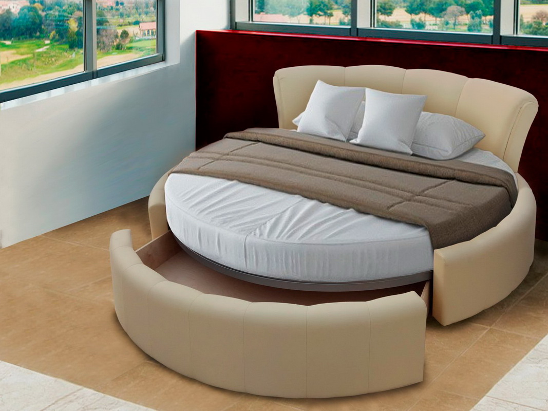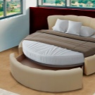 - Runde - Es hat einen großen Schlafplatz, sein Durchmesser ist nicht weniger als 2,2 Meter, so dass es ein großartiger Ort zum Entspannen wird. Diese Art von Möbeln ist perfekt für ein Zimmer im Stil von High-Tech, Modern oder Art Deco. Es wird auch in einem klassischen Schlafzimmer elegant aussehen.
