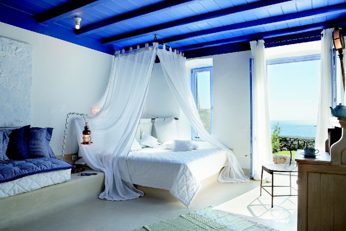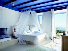 - Mediterraner Stil bevorzugt ein großes schmiedeeisernes Bett, geschnitzte Möbel, das Zimmer hat ein Minimum an Dekor, sowie die Verwendung von Weiß.