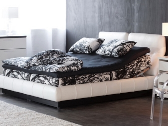 - Leder - So ein luxuriöses Modell ist praktisch und hygienisch. Um es in Ordnung zu bringen, genügt es, die Oberfläche mit einem feuchten Tuch abzuwischen und es gibt keine Spuren von Verunreinigungen. Im heißen Sommer ist es kühl, sich auf einem solchen Bett auszuruhen, und im Gegensatz dazu ist es in einem kalten Winter warm und sehr bequem.