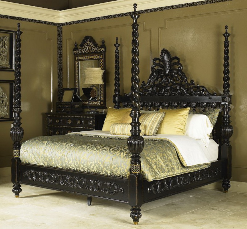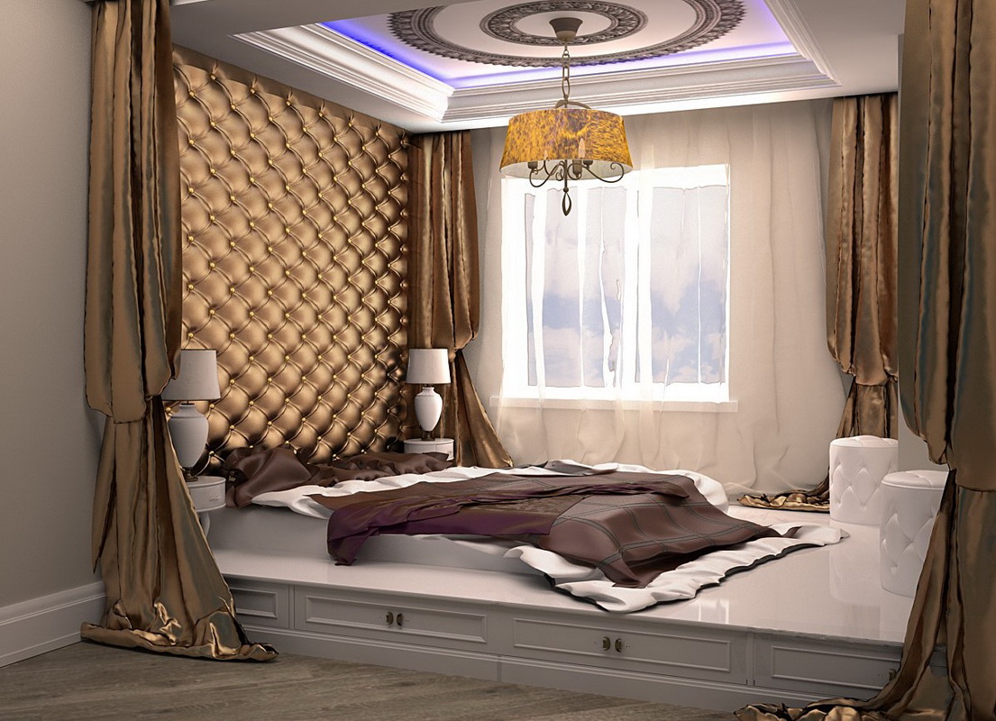 - Osten - Verwenden Sie ein niedriges Bett mit gebogenen Beinen, das mit einem Baldachin geschmückt ist. Es sollte aus massivem Holz sein, verziert mit Schnitzereien, Gemälden oder Intarsien.